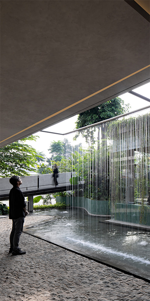 Il progetto è orientato lungo un asse nord-sud per preservare la vegetazione esistente nel giardino posteriore e per creare un “corridoio d’aria” naturale capace di canalizzare le brezze tropicali attraverso l’intero edificio. Questa scelta, apparentemente tecnica, assume un valore importante: la ventilazione non è un semplice requisito ambientale, ma diventa parte dell’esperienza architettonica, un soffio che collega il microcosmo interno al paesaggio esterno.