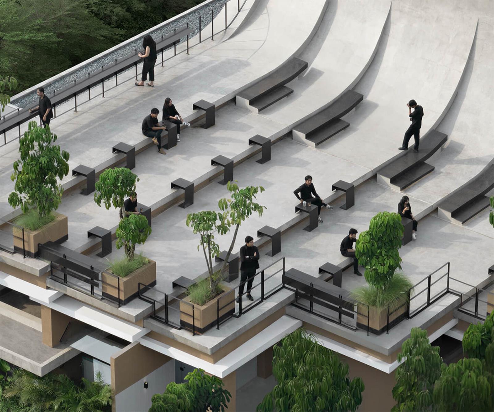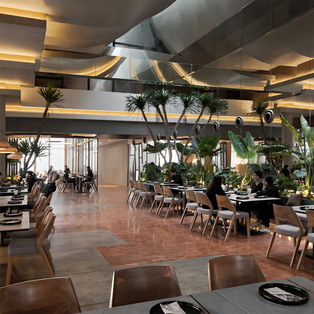 La cifra formale di Aruma Split Garden si regge su un principio apparentemente semplice, eppure profondamente ricco di implicazioni: il design a livelli divisi (split-level design). Questo approccio non separa gli spazi come compartimenti stagni, ma li ordina in un continuum di percorsi, sguardi e relazioni. Le zone commerciali si elevano l’una sull’altra, la vegetazione scivola tra le superfici orizzontali e verticali, e la luce naturale si insinua dappertutto.