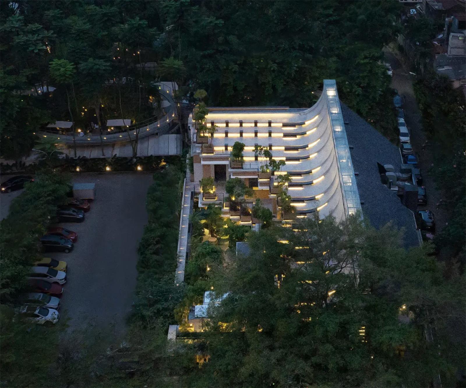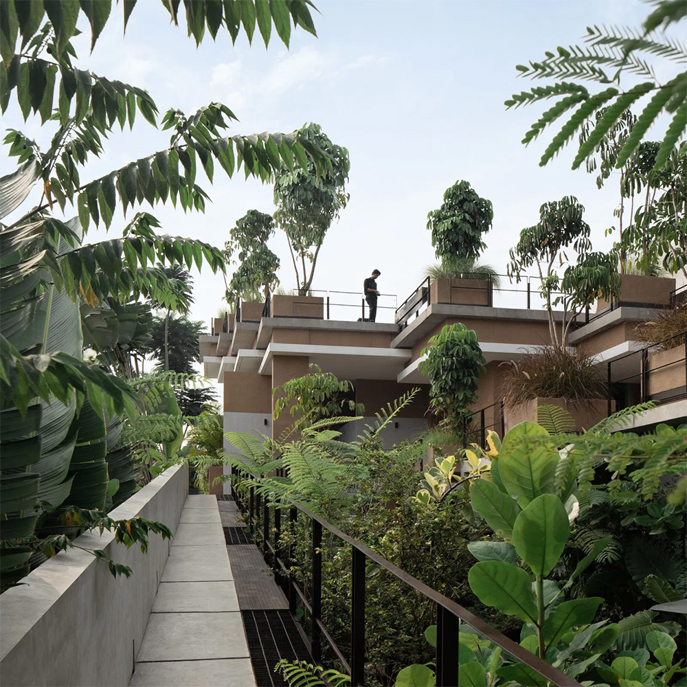 La materialità di Aruma Split Garden si inscrive in un linguaggio contemporaneo che non rinnega la concretezza della costruzione né la ricerca sensoriale. Il calcestruzzo a vista delle terrazze ondulate dialoga con la vegetazione lussureggiante e con i materiali naturali scelti per gli interni, creando un equilibrio sottile tra ruvidità e leggerezza.