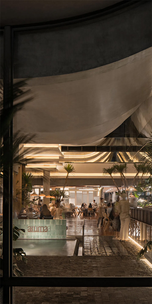 Nell’immaginare Aruma Split Garden, RAD+ar parte da un problema molto concreto — l’aumento vertiginoso del valore del terreno in città — e lo trasforma in un’opportunità progettuale. La sfida non è tanto quella di occupare lo spazio, quanto di riprogrammarlo, facendo coesistere diverse funzioni commerciali (ristoranti al piano terra, bar al mezzanino, beer garden sul tetto) entro uno stesso fluido sistema di relazioni.