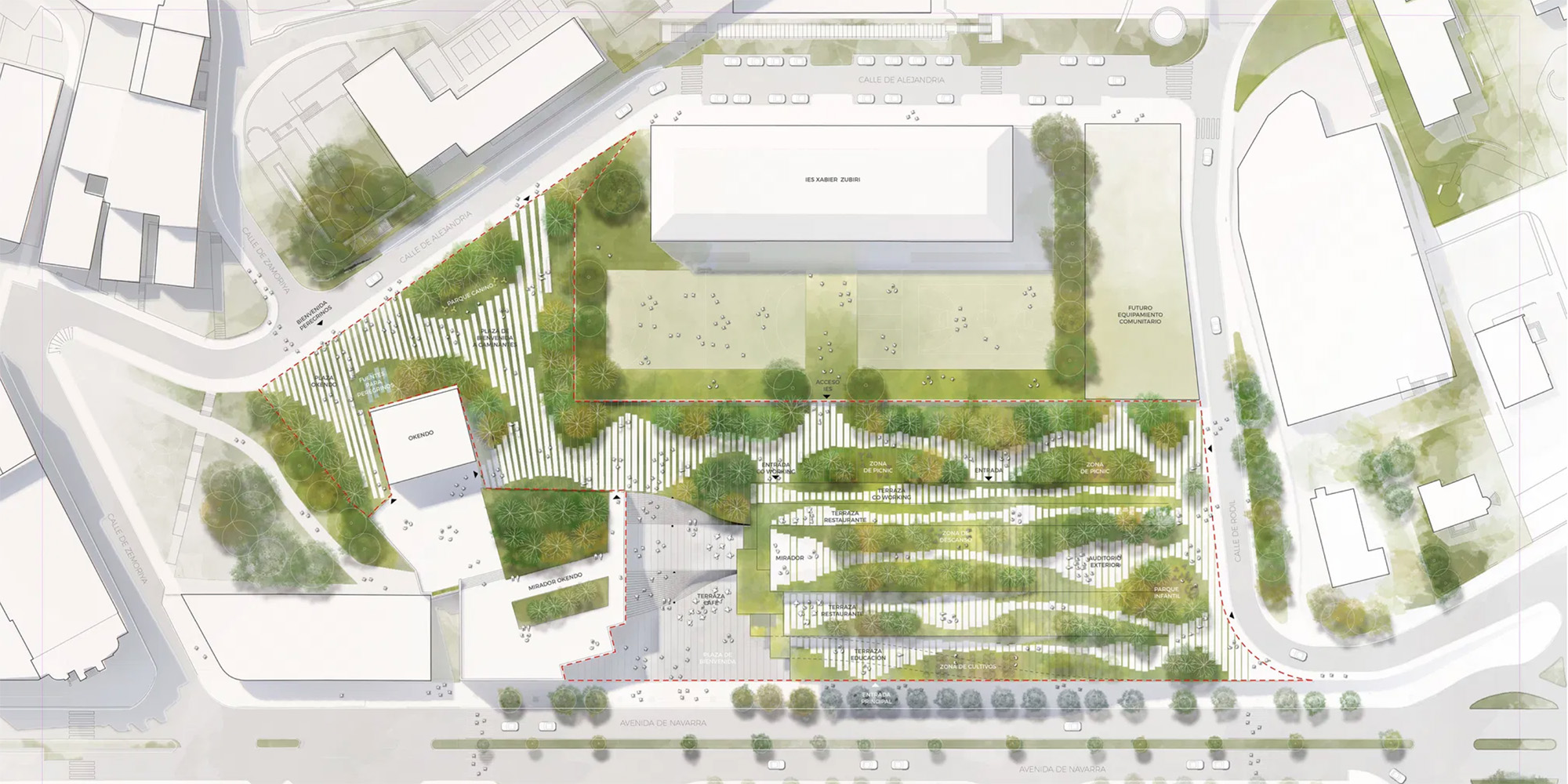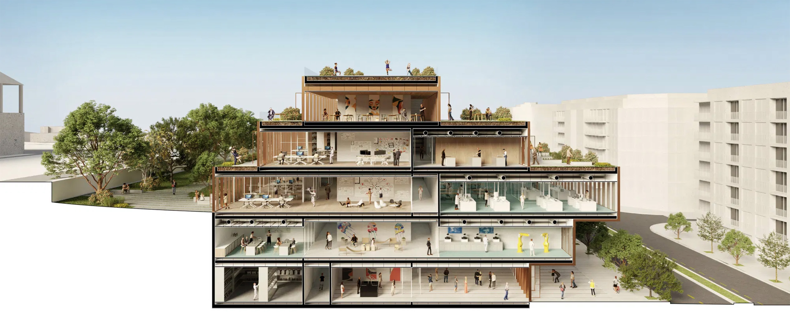 Alla base del concept c'è l'idea di ecosistema: una sequenza di volumi e piattaforme interconnesse che si sviluppano orizzontalmente, dissolvendo il confine tra interno ed esterno.