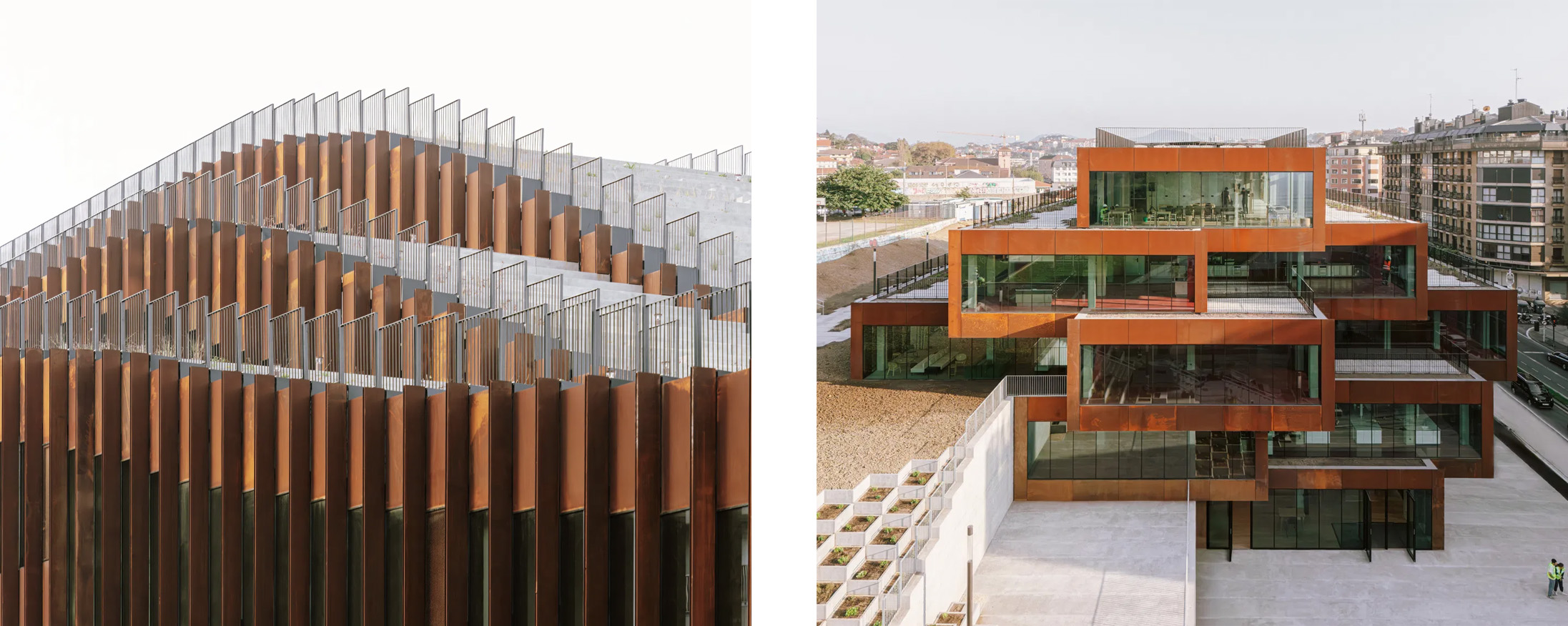 Le facciate alternano superfici vetrate ad alte prestazioni, pannelli in policarbonato traslucido e schermature solari in legno, creando un equilibrio tra trasparenza, controllo climatico e comfort interno. All'interno, finiture grezze e materiali naturali sottolineano il legame con i temi della produzione e della trasformazione alimentare.
