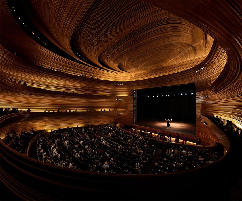 Al centro dell’opera troneggia la sala principale, avvolta in fasce orizzontali di legno stratificato. Questa struttura lignea non è solo estetica: modula l’acustica e garantisce una perfetta visuale del palco da ogni balconata. Secondo BIG, i cerchi concentrici di legno dissolvono il confine fra artisti e pubblico, trasformando la sala in un’esperienza immersiva.