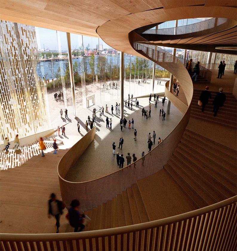 Dal punto di vista dell’accessibilità, l’edificio è pensato come un luogo aperto: si può raggiungere l’ingresso da più direzioni — via parco, dal molo o dalla nuova Opera Street sul ponte Baakenhafenbrücke. Le scale centrali in legno che dominano il foyer sono animate e servono da elemento di congiunzione tra i piani e il tetto giardino, donando un senso di accoglienza e calore.