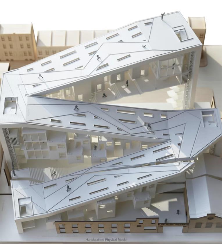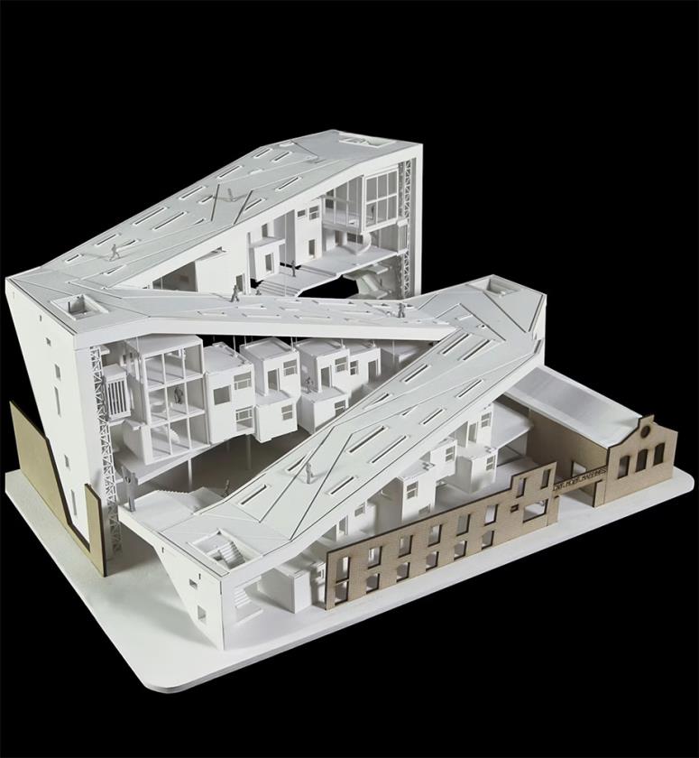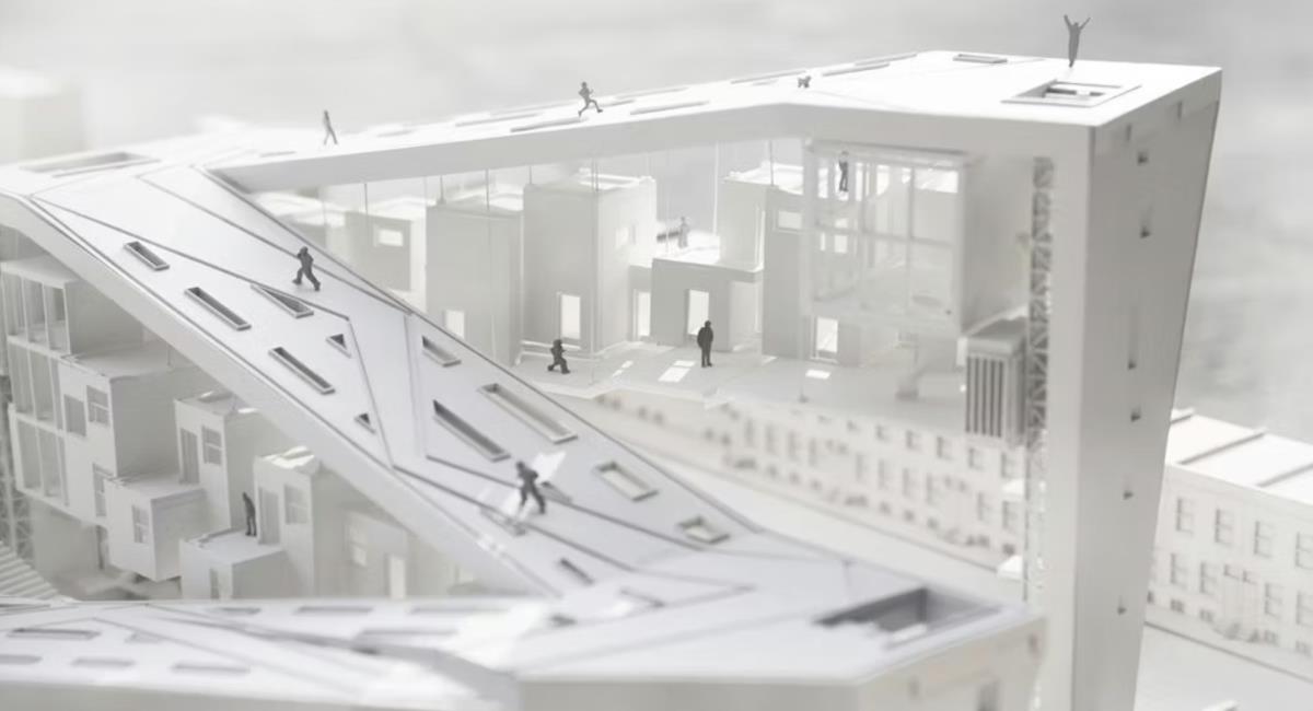 Beacon House è pensato per essere costruito su un sito nel centro di Philadelphia, vicino ai resti di un vecchio mulino abbandonato, elemento che entra nel progetto come metafora di rinascita e rigenerazione urbana. Attraverso la sua forma dinamica e leggermente torsionata, l’edificio cattura ampie vedute dello skyline cittadino — vista spesso negata alle persone senza casa — e le rende parte integrante dell’esperienza quotidiana dei residenti.