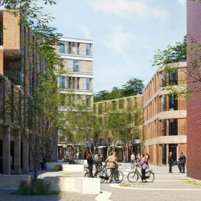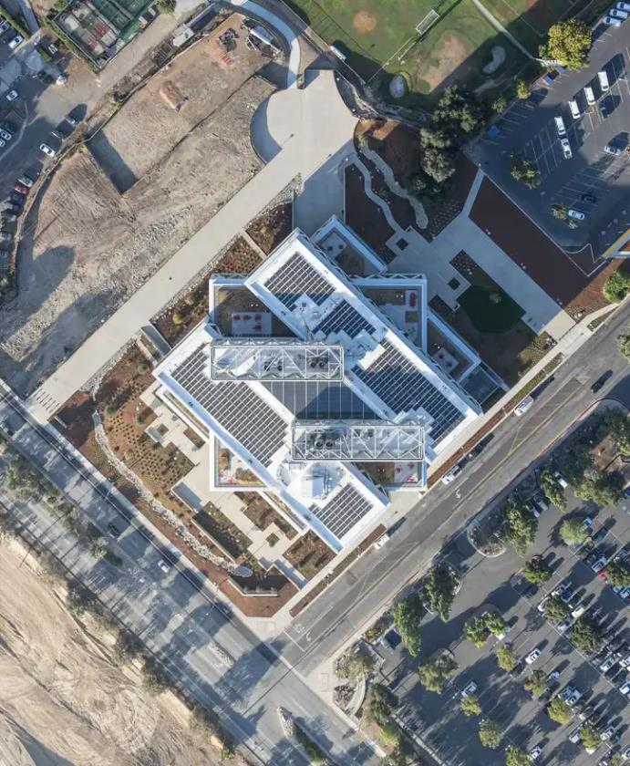 Il progetto non è solo estetica: il complesso mira alla certificazione LEED Gold e incorpora pannelli solari per sostenere parte del proprio fabbisogno energetico. Nel prospetto composito, pannelli di calcestruzzo fibrorinforzato a stampo ligneo imitano texture naturali, unendo durabilità e identità tattile.