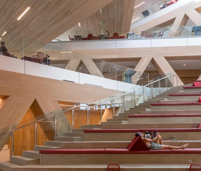 All’interno, un atrio a tutta altezza si apre al cielo e mette in comunicazione ogni livello. Le facciate più corte sono vetrate, offrendo visuali affascinanti sulle attività dei laboratori, mentre i lati lunghi sono segnati da travi triangolate rivestite in legno che richiamano una tessitura materica tra interno ed esterno. Le terrazze all’esterno, otto in totale, presidiano il panorama: scorci sulle montagne a nord, spazi di incontro, classi all’aperto che si affacciano sul campus e sull’orizzonte del “sports bowl” a est.