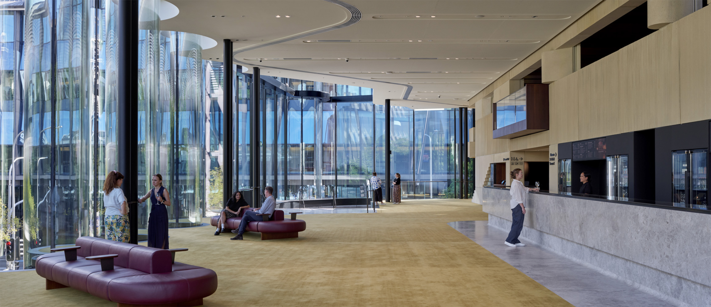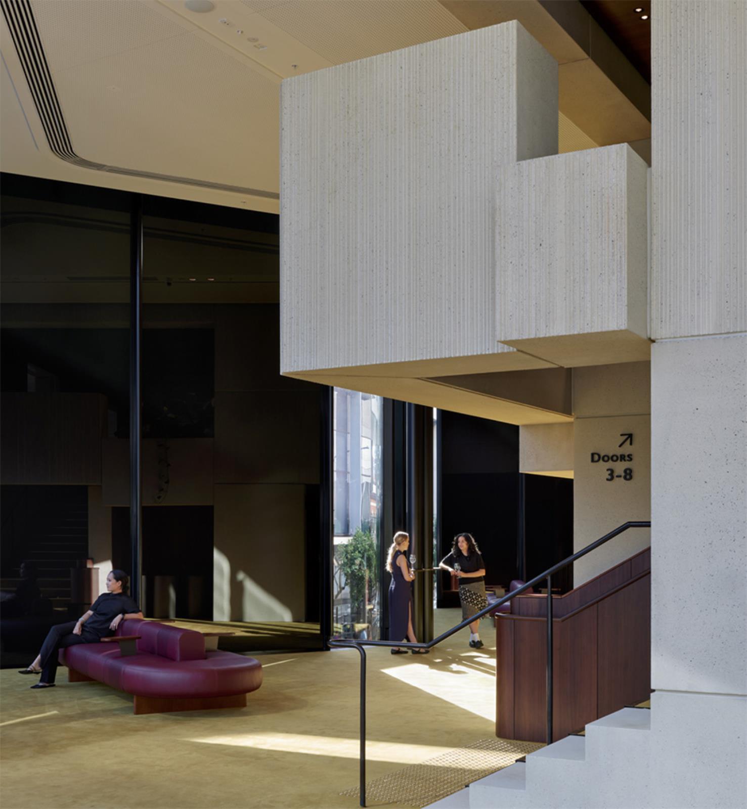 All’interno, i colori e i materiali evocano direttamente i paesaggi del Queensland: il tappeto verde dell’auditorium richiama le foreste pluviali, mentre i tappeti dorati e il calcestruzzo color sabbia degli spazi del foyer riflettono le spiagge soleggiate dello Stato.