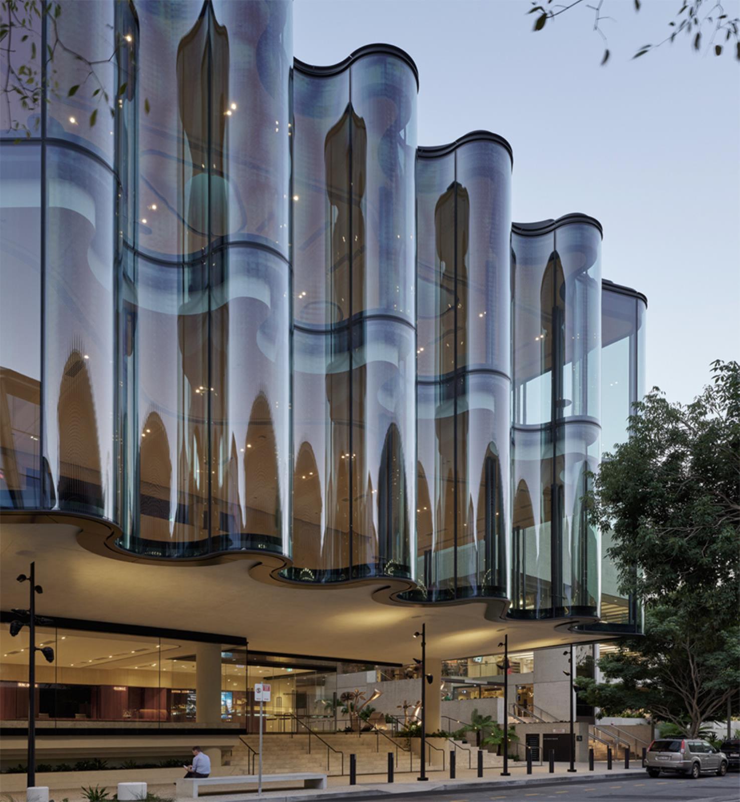Il Glasshouse Theatre nasce su un sito compatto tra le vie di Russell e Grey Street, inserendosi nel complesso del Queensland Cultural Centre. La sua forma è fortemente iconica e si distingue per una facciata di vetro ondulata e trasparente, concepita come “vela urbana” che riflette e dialoga con le acque del vicino Brisbane River.