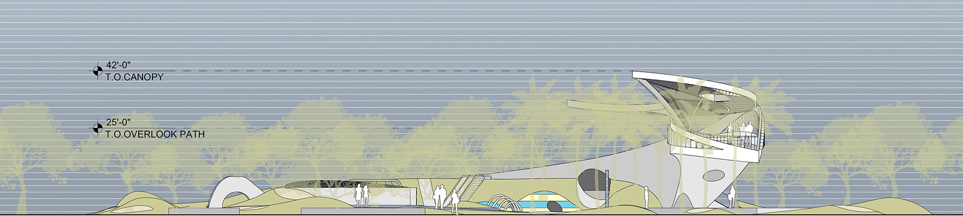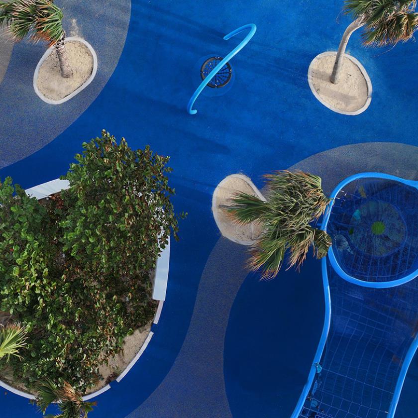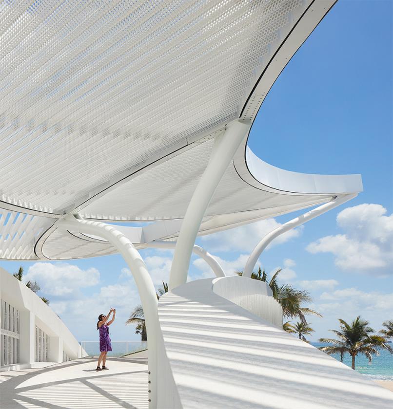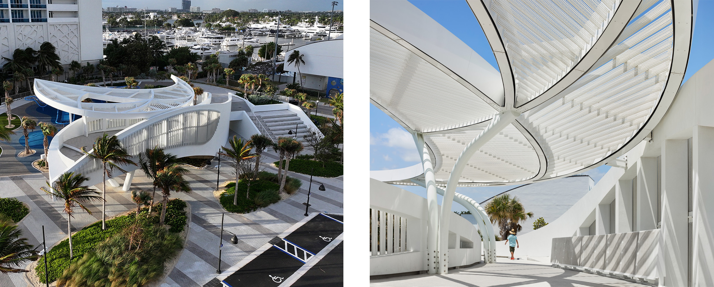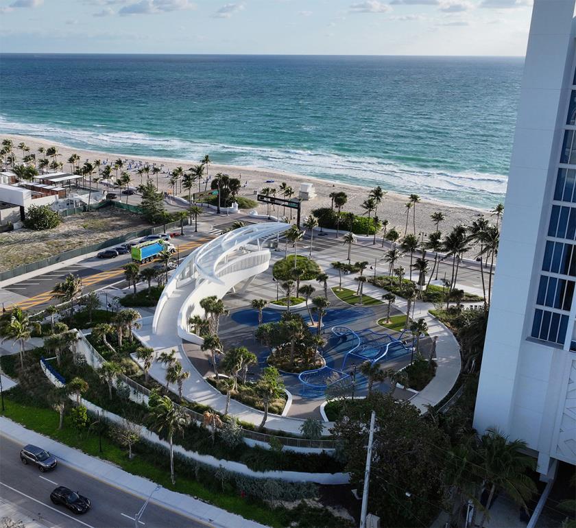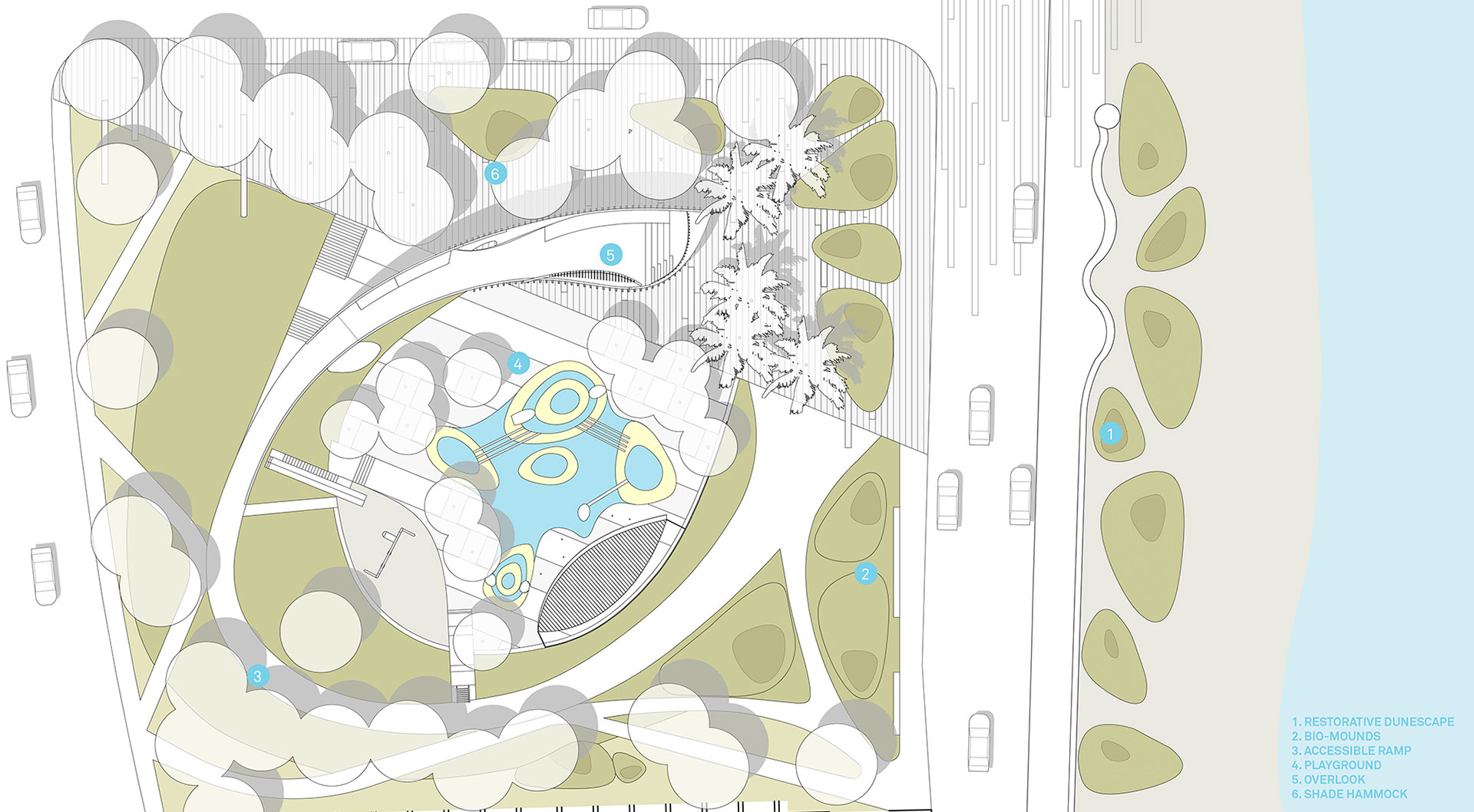 Sul limite nord del sito, emerge una piazza costiera condivisa, progettata per rallentare il traffico: un ombrello arboreo getta ombre leggere grazie al fogliame delle specie native, creando un microclima fresco anche sotto il sole della Florida.
