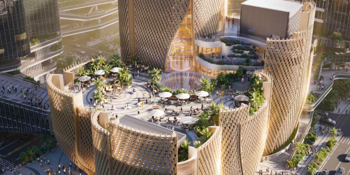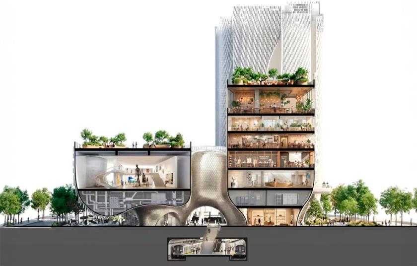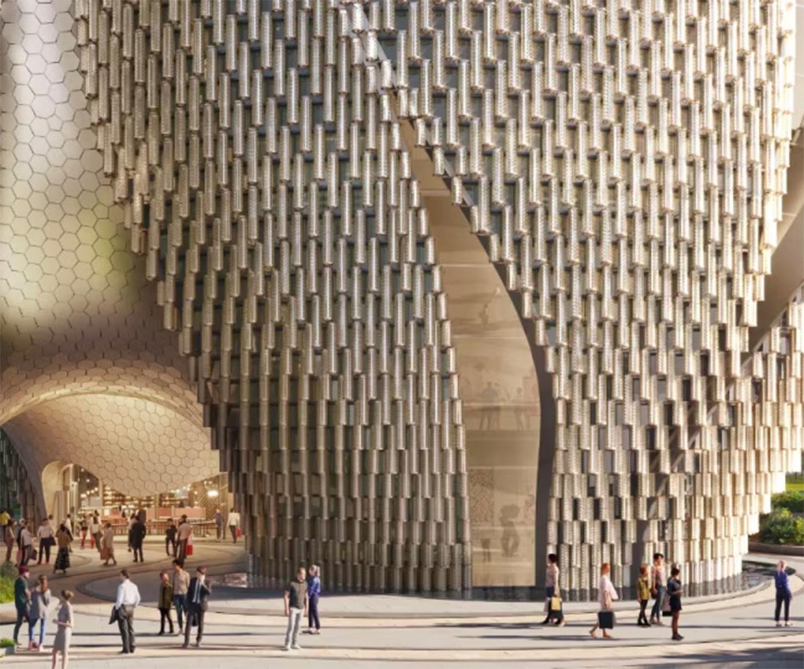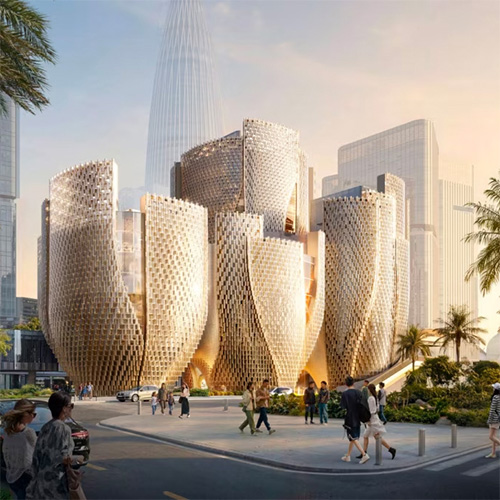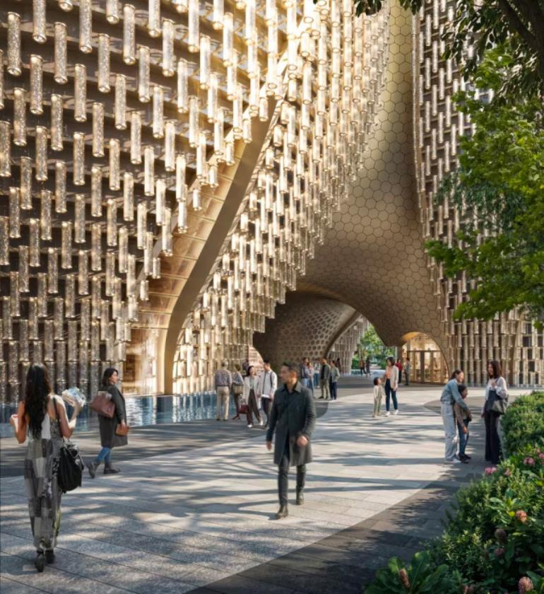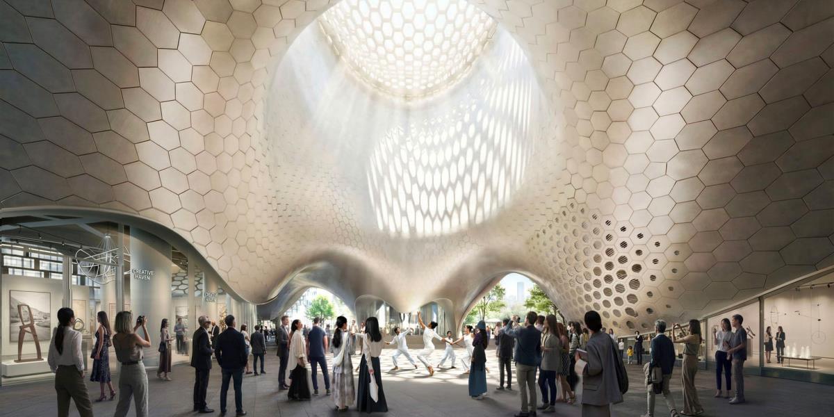 Il progetto di Büro Ole Scheeren gioca con la relazione tra terra e cielo, sollevando i volumi principali dell’edificio su basi sottili per creare spazi pubblici coperti e percorsi urbani integrati. La disposizione delle masse architettoniche è stata pensata per generare un continuum tra strade, piazze, spazi culturali e aree verdi, rendendo il museo accessibile non solo ai visitatori, ma anche alla comunità urbana quotidiana. La strategia di elevazione permette inoltre di aumentare la permeabilità visiva e climatica del campus, offrendo ombra, ventilazione naturale e spazi ricreativi all’aperto.