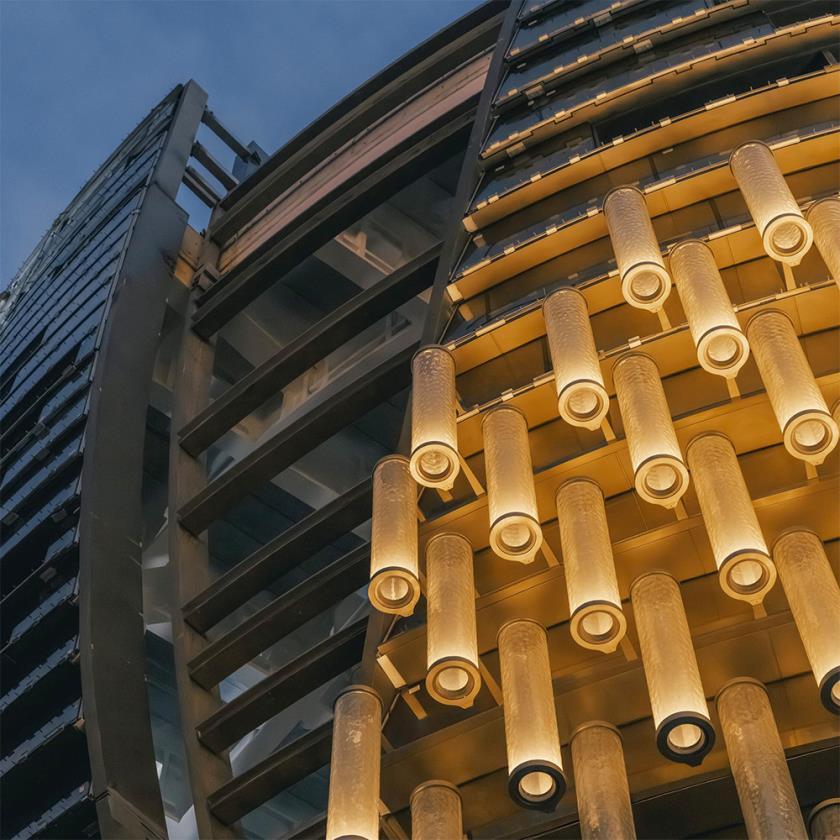 Il mantello esterno è composto da moduli di vetro assemblati in tubi verticali con diametri variabili, una soluzione che deriva da un processo di progettazione parametrica digitale. Ogni tubolare non è identico: la loro geometria varia in funzione dell’orientamento rispetto al sole, dell’altezza del volume e dell’angolo di visuale verso l’esterno, secondo algoritmi generati in fase di progettazione per ottimizzare la risposta luminosa e termica delle superfici.