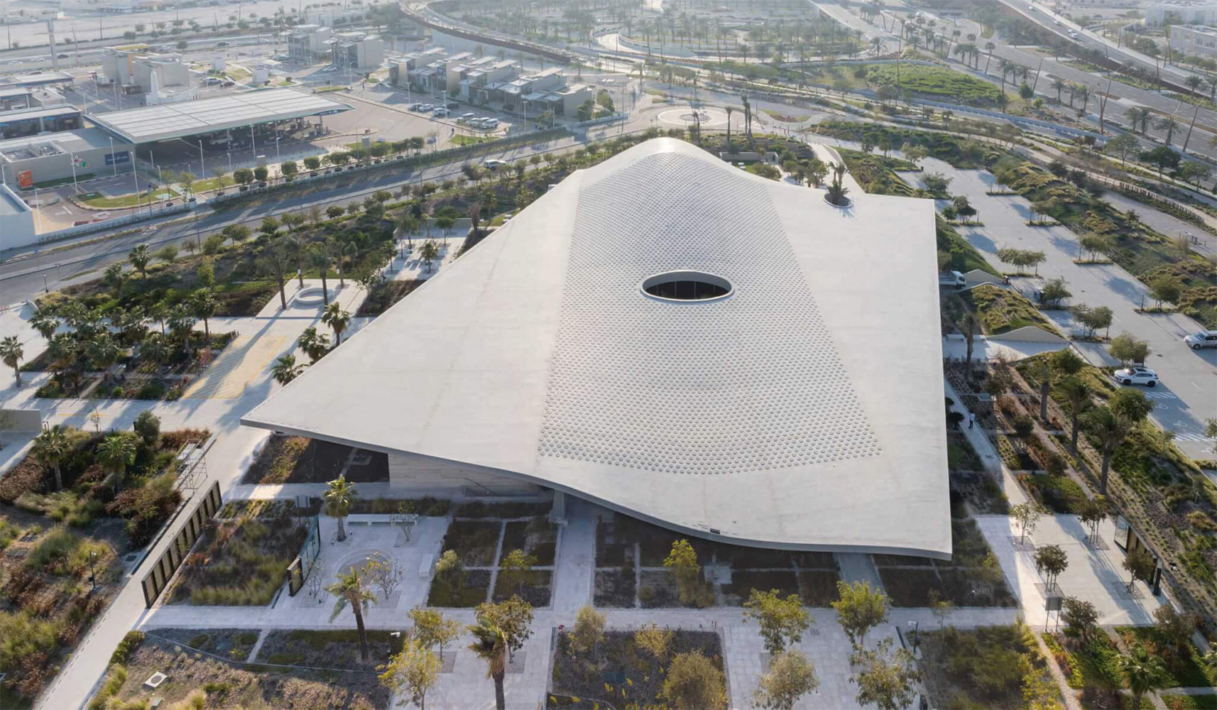 La struttura di circa 4.600 m2 si sviluppa attorno a un grande tetto ondulato che si estende come un lenzuolo bianco sospeso sul deserto. Tale copertura, caratterizzata da oltre 5.000 “pozzi di luce” – bocche di diametro ridotto che filtrano la luce abbondante del Qatar – modula la luminosità all’interno, creando un’atmosfera mistica e insieme accogliente. Il corpo del fabbricato ruota di 17° rispetto alla griglia urbana, per allineare la parete della qibla verso La Mecca, come tradizione richiede.