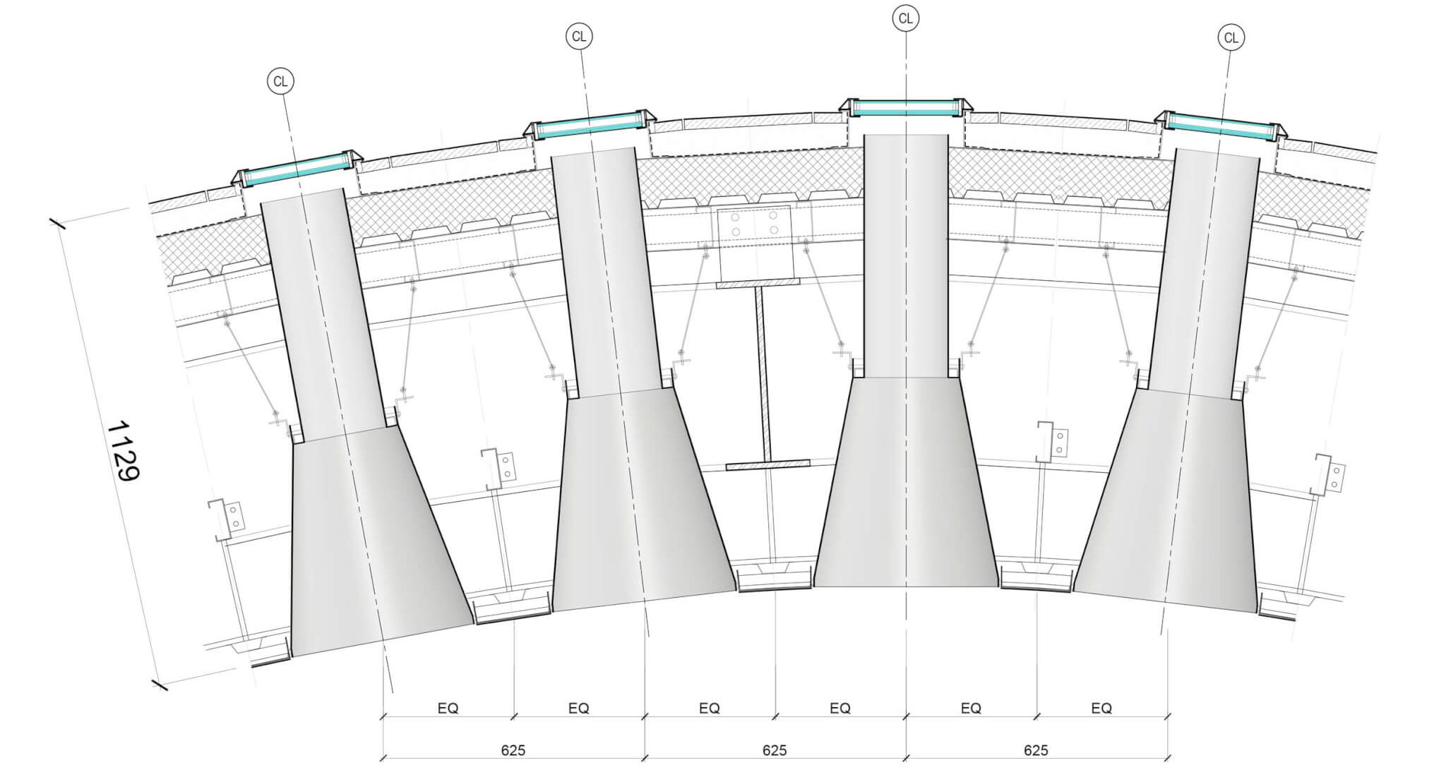 Nel cuore del progetto, l’aula di preghiera (circa 875–890 m2) ospita fino a 750 fedeli e in occasioni speciali – come il Ramadan – può estendersi fino a 1.300 partecipanti. La parete della qibla, ondulata e in acciaio-travertino, definisce due punti chiave: il mihrab e il minbar, resi visibili grazie a una luce zenitale che aleggia dall’apertura nel tetto.