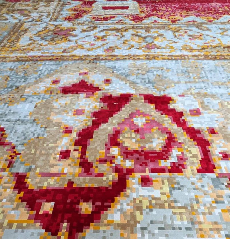 Il tappeto, realizzato in lana della Nuova Zelanda e progettato su scala monumentale (assemblando il modello di un tappeto singolo in un’unica estensione), ridefinisce la geometria del rituale: ogni fila di preghiera è percepita come un tracciato riconoscibile.
