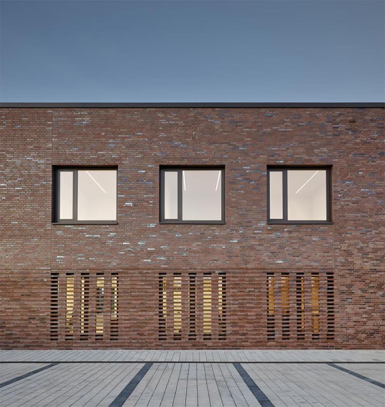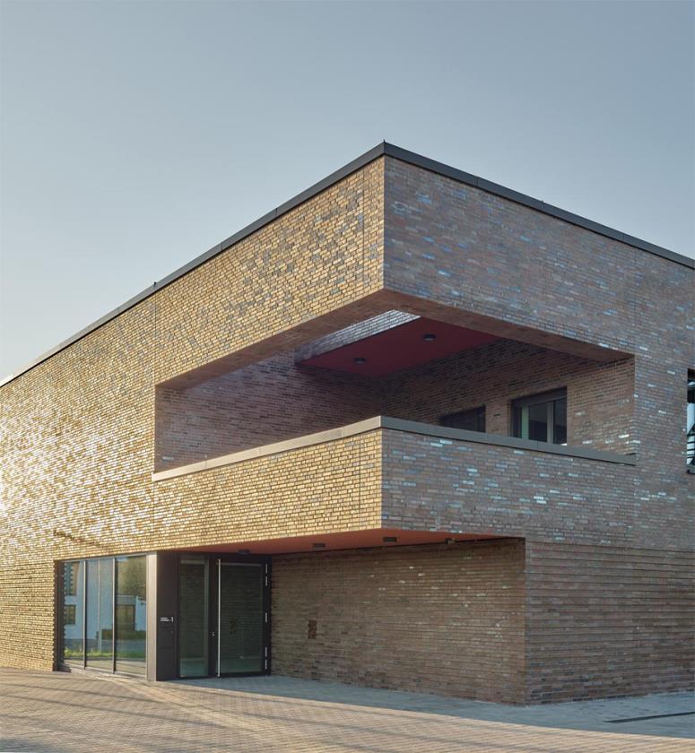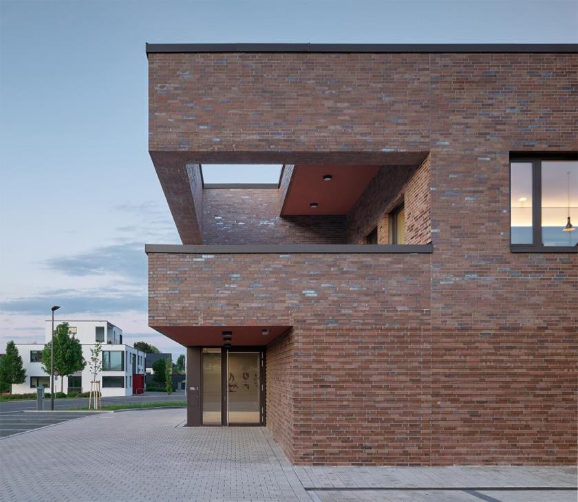 La facciata esterna, caratterizzata da un mattone in clinker di colore marrone-rossiccio disposto con texture libera, contribuisce non solo a dare profondità tattile alla pelle dell'edificio, ma anche a incrementarne la durabilità contro le intemperie e l'usura. Questo materiale ceramico di alta resistenza (tipico della tradizione costruttiva tedesca) è stato scelto per unire carattere visivo e performance ambientale, riducendo al contempo la necessità di manutenzioni frequenti nel tempo.