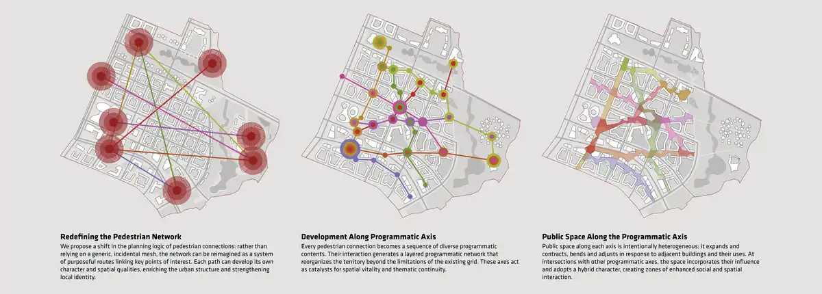 Al cuore del masterplan c’è un concetto di città che si libera da rigide geometrie, facendo spazio a reti urbane fluide e interconnesse. Spazi pubblici diversificati, corridoi verdi e una trama di piazze e vie pedonali si combinano per creare luoghi identitari capaci di accogliere comunità diverse, favorire interazioni sociali e sostenere attività culturali e commerciali. Questo tipo di urbanismo pone l’accento sulla resilienza territoriale e sulla capacità dei nuovi quartieri di evolvere nel tempo, rispondendo ai bisogni emergenti dei cittadini.