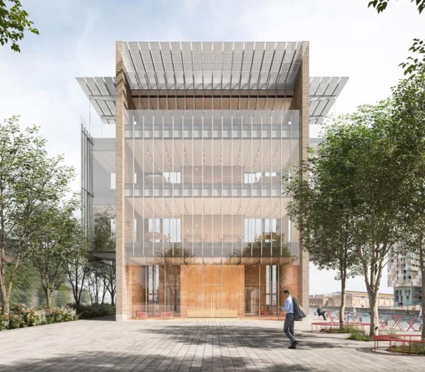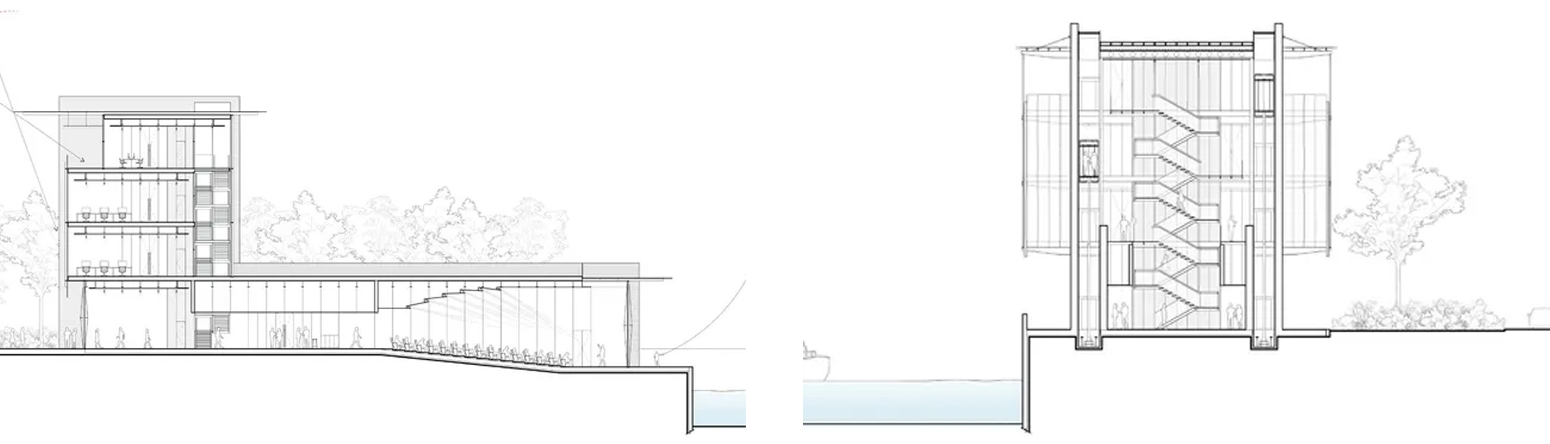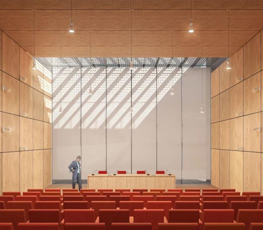 Questa relazione dinamica tra dentro e fuori, tra architettura e paesaggio, è al centro dell’idea progettuale: la sala eventi, cuore pubblico dell’edificio, è caratterizzata da una grande vetrata a tutta altezza che si affaccia direttamente sulla Darsena, trasformando ogni evento — conferenza, mostra o incontro pubblico — in un’esperienza che si fonde con il contesto urbano e naturale.