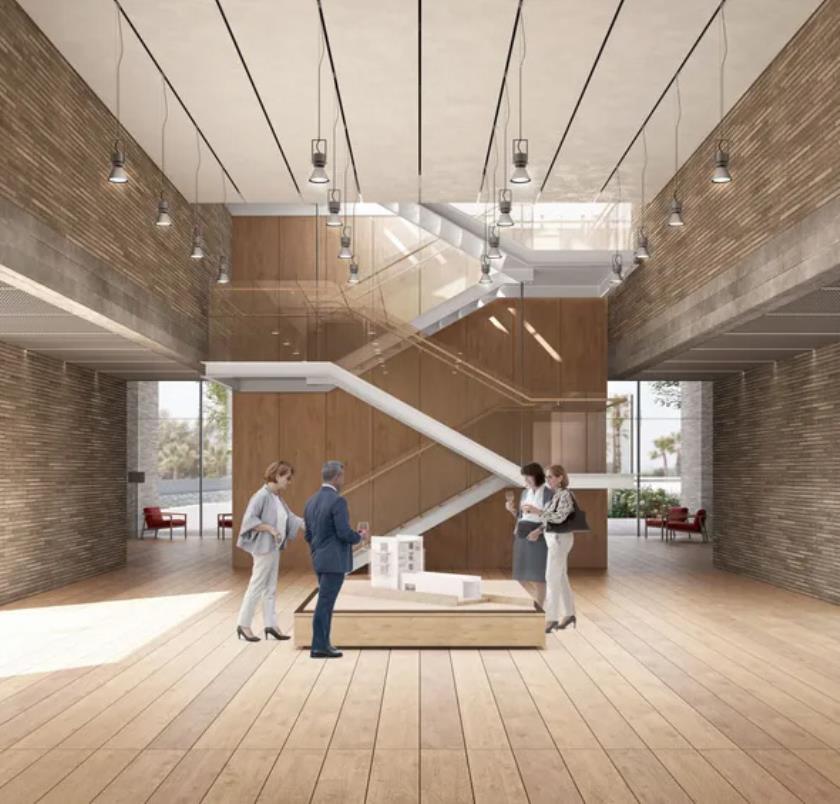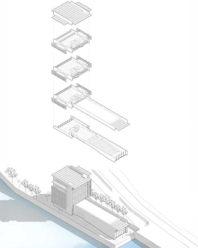 La planimetria interna è pensata per garantire flessibilità e adattabilità, con uffici disposti attorno a una pianta libera e spazi interni che possono essere riconfigurati a seconda delle esigenze istituzionali o delle attività culturali che si andranno a svolgere. Al primo piano, una caffetteria panoramica con terrazza si affaccia sul paesaggio d’acqua, offrendo uno spazio di relazione informale che promuove interazione sociale e apertura pubblica.
