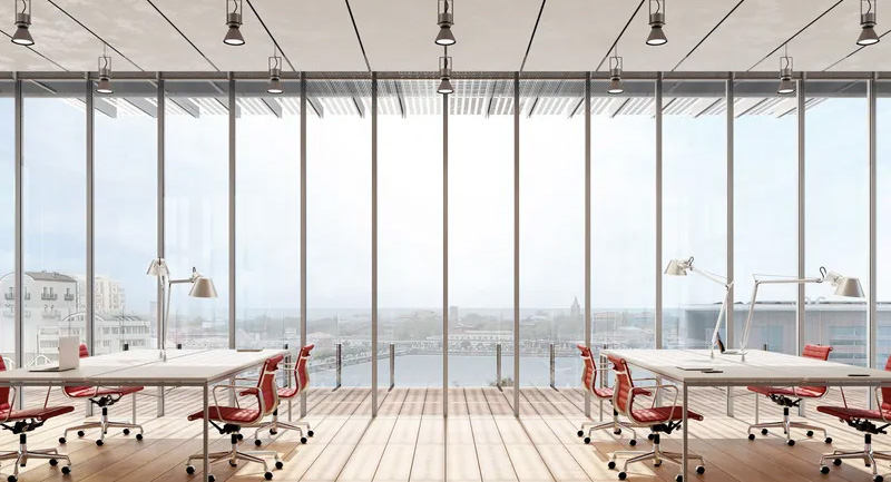 Allo stesso tempo, la permeabilità visiva del progetto è garantita da ampie superfici vetrate, dotate di un sistema di vetro laminato isolante che delimita aree trasparenti e opache con grande precisione: gli spazi interni si aprono verso il paesaggio della Darsena, il Canale Candiano e l’orizzonte marino, offrendo punti di vista continui e scenografici sulla città e sull’acqua.
