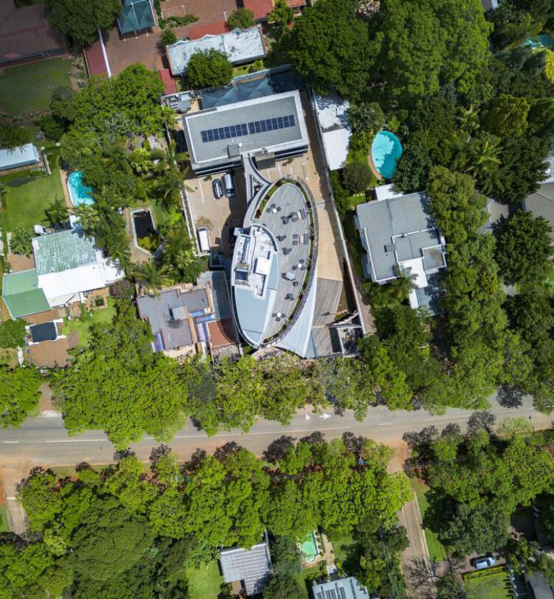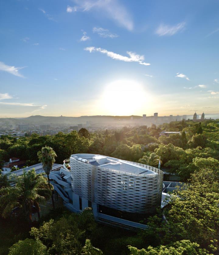 Esternamente, l’edificio si caratterizza per la sua pelle architettonica che integra vetro e acciaio, materiali che garantiscono leggerezza, trasparenza e prestazioni climatiche adeguate al clima sudafricano.