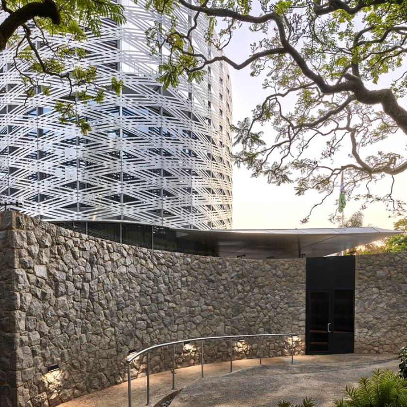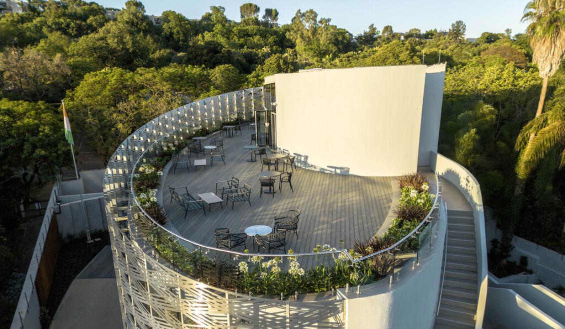 GLH Architects — studio con base a Johannesburg e Pretoria attivo dal 1945 e noto per progetti che spaziano da residenze e uffici a edifici istituzionali — ha concepito la nuova Ambasciata come un edificio in cui la forma ellittica delle geometrie esterne dialoga con la pianta interna, accompagnando i visitatori attraverso una sequenza spaziale fluida e conviviale. Le fotografie ufficiali del progetto mostrano come la facciata si apra con un ritmo calibrato di superfici vetrate e pannellature, integrando l’accesso pedonale e carrabile con eleganza e offrendo viste controllate verso gli ambienti interni.