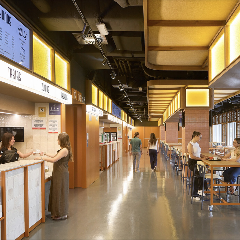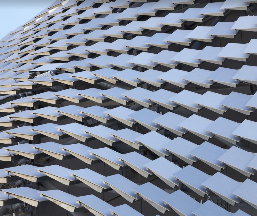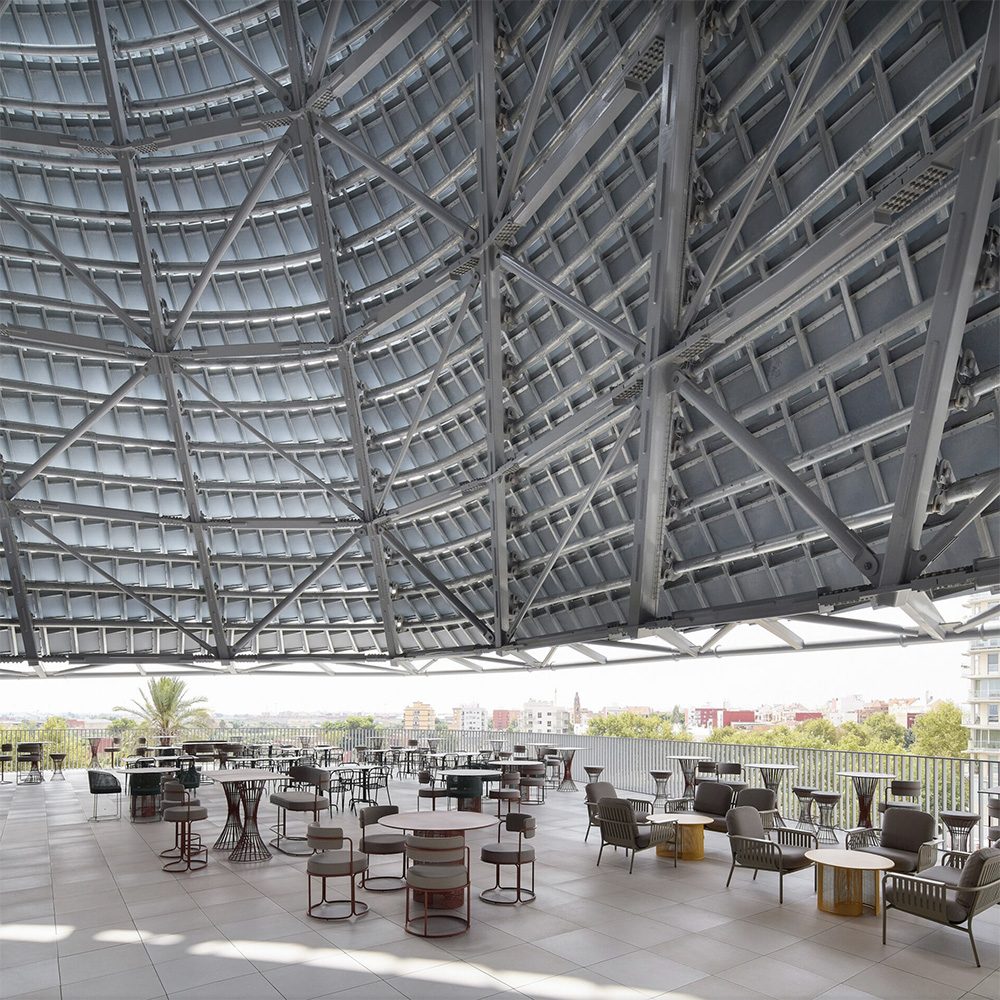Il cuore concettuale e visivo del progetto è la facciata: una pelle composta da 8.600 lamelle ceramiche (Valencia è con Faenza e Mashiko una delle capitali della ceramica) disposte come squame su una struttura in acciaio a doppia curvatura. ERRE ha progettato ogni elemento ceramico su misura, reinterpretando un materiale profondamente radicato nella tradizione locale valenciana e adattandolo a un involucro architettonico di grande complessità geometrica. La ceramica, solitamente applicata su superfici piane, viene qui trasformata in un sistema tridimensionale capace di vibrare con la luce mediterranea.