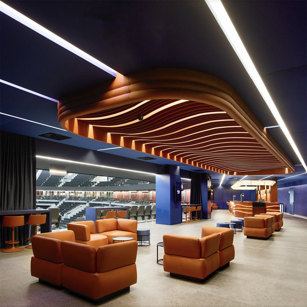 La texture delle doghe ceramiche evoca volutamente la superficie di un pallone da basket, un riferimento diretto allo sport che ha ispirato e promosso il progetto. La Roig Arena è infatti la nuova casa delle squadre maschili e femminili del Valencia Basket Club, e questa citazione materica trasforma la facciata in un racconto silenzioso ma leggibile. Tre diverse tonalità di smalto blu introducono variazioni cromatiche minime ma continue, accentuando la profondità visiva dell'involucro.