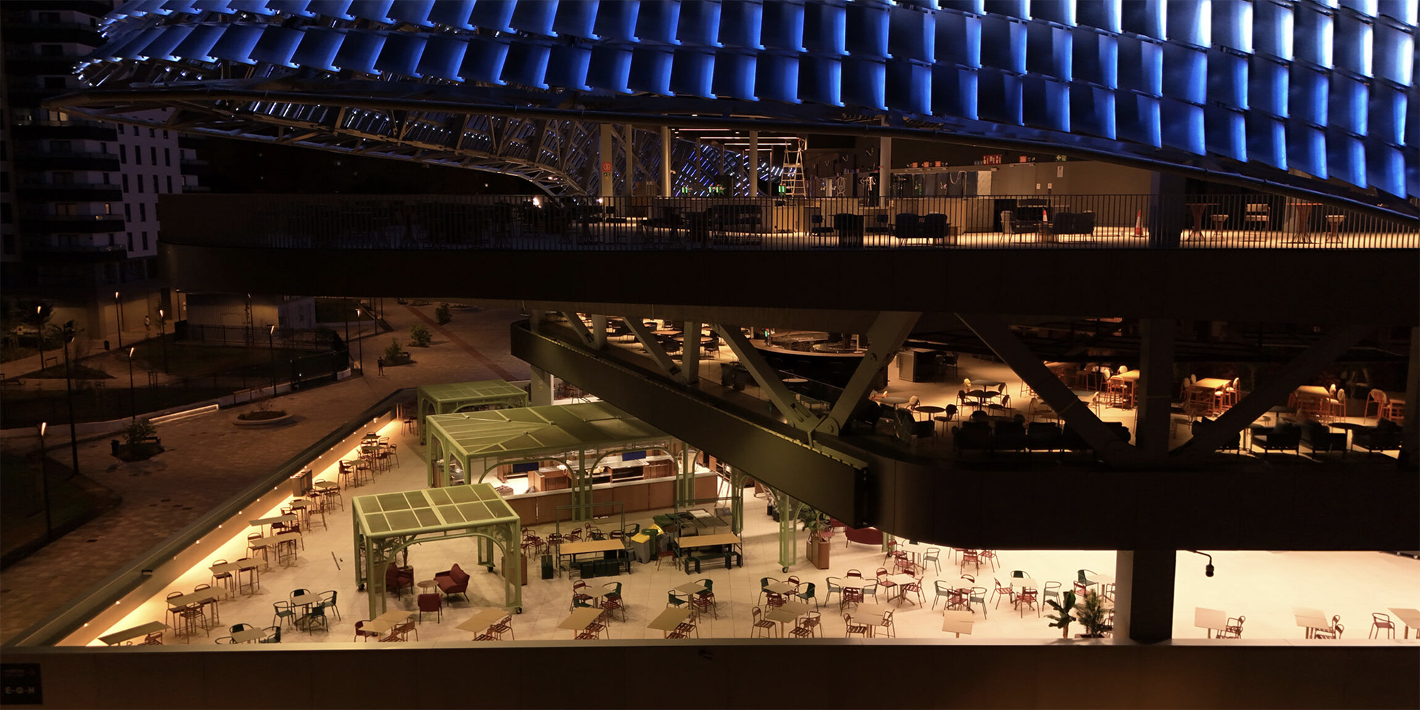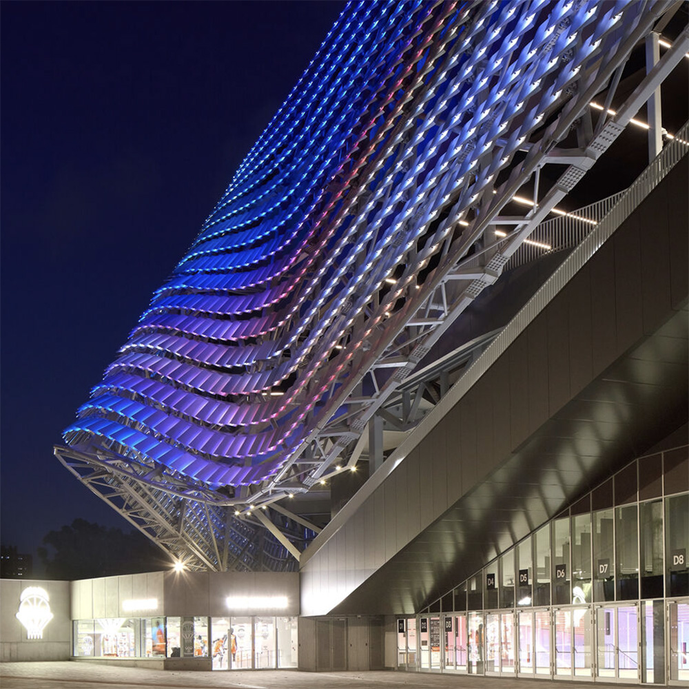 Durante il giorno, le lamelle svolgono anche una funzione ambientale fondamentale: ombreggiano le terrazze perimetrali, riducono il carico termico e favoriscono la ventilazione naturale degli spazi esterni. Di notte, invece, la facciata rivela la sua seconda natura. Grazie a un sistema di illuminazione LED RGB-White, l'edificio si trasforma in una superficie luminosa dinamica, capace di interagire con dati in tempo reale e di generare scenari visivi che rendono l'arena un vero landmark urbano, visibile e riconoscibile anche a distanza.