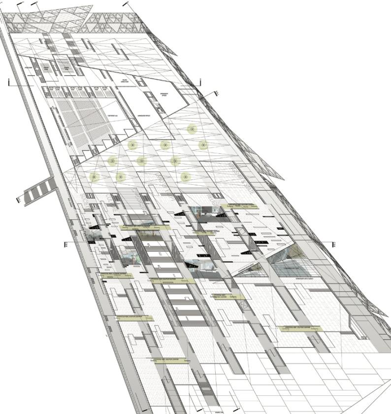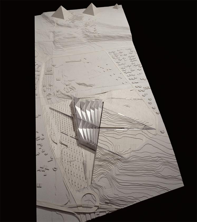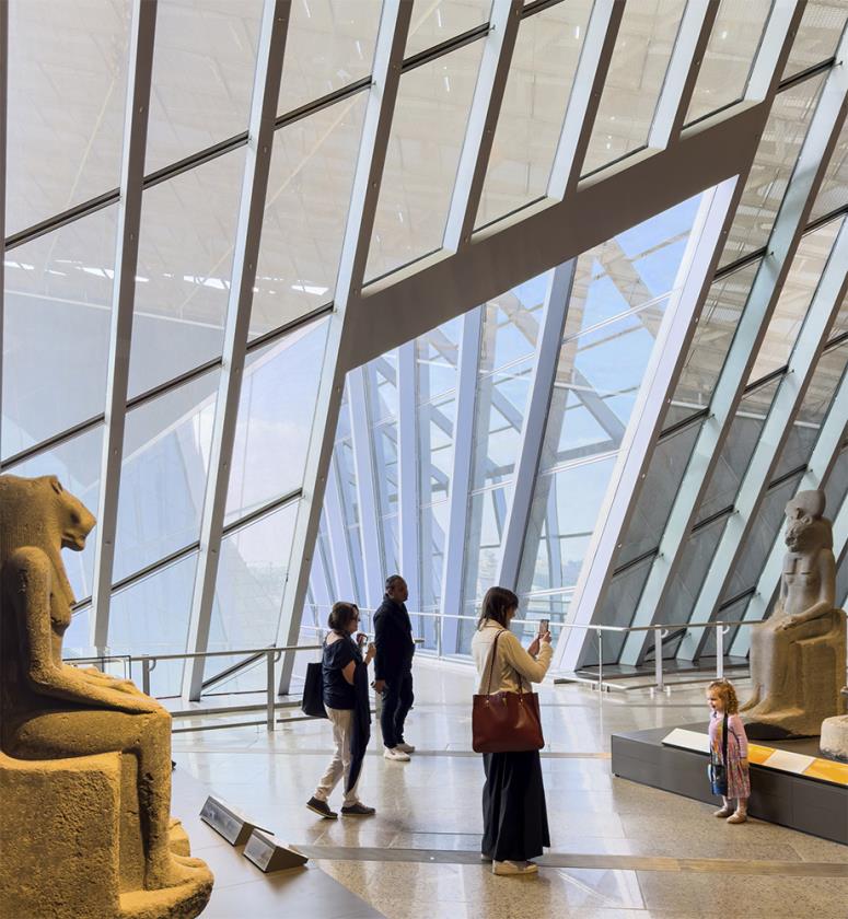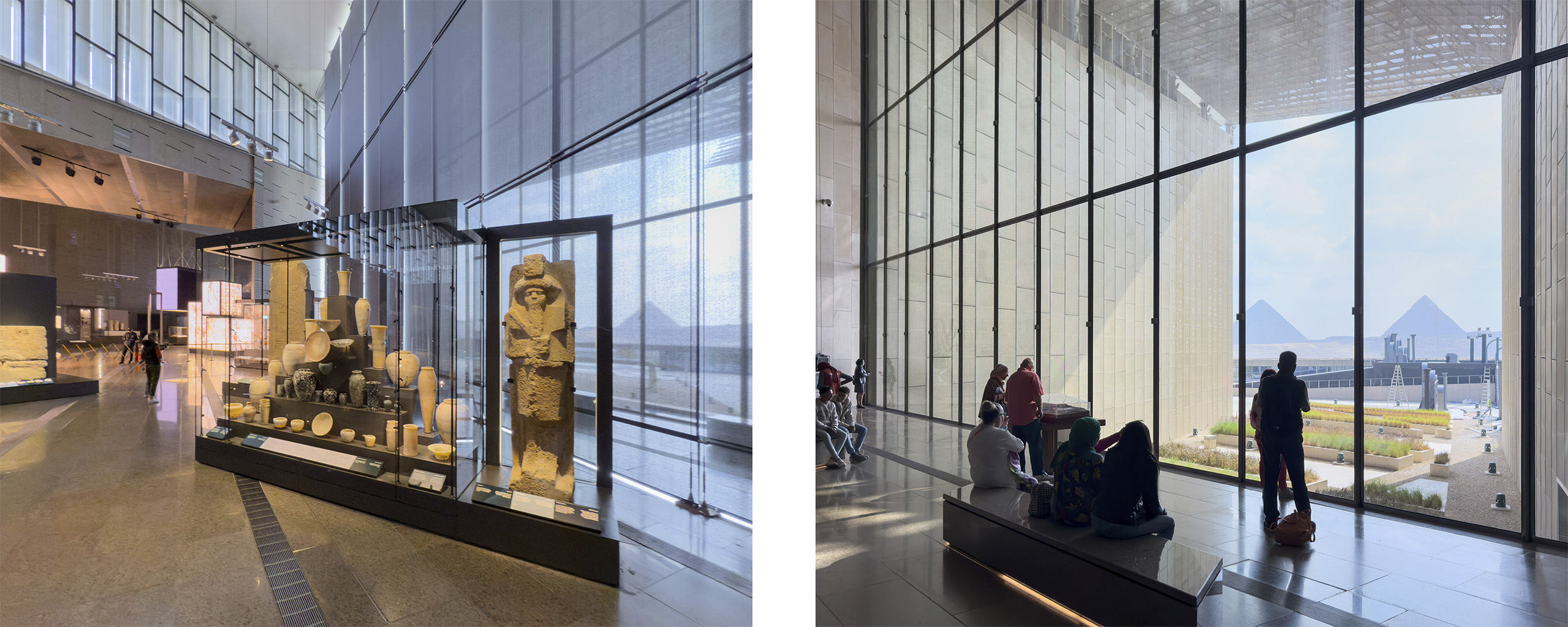 Nel suo cuore pulsa un atrio monumentale, coronato da un lucernario che filtra la luce desertica, e una grande scala che connette i livelli del museo. Imponenti vetrate e superfici traslucide in pietra suggeriscono un “velo” che sfuma tra interno ed esterno, aprendo panorami visivi verso le piramidi. Il progetto sfrutta la differenza di quota tra la valle e l’altopiano, integrandosi nel rilievo naturale: il museo mai si eleva completamente sopra l’altopiano, ma si insinua come un confine nuovo del plateau.