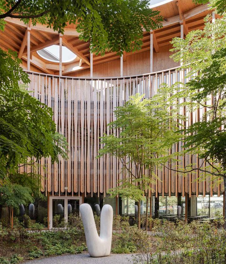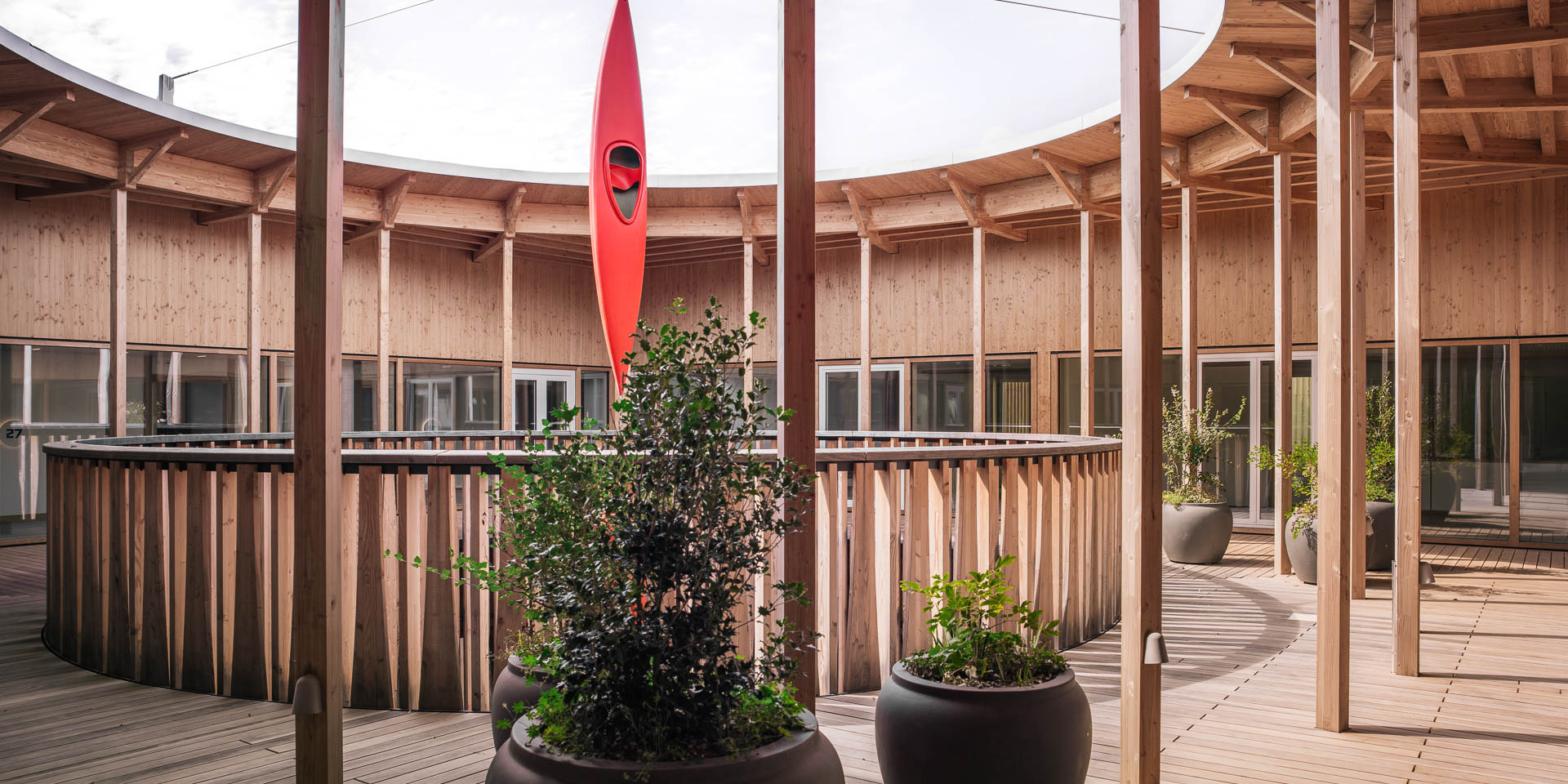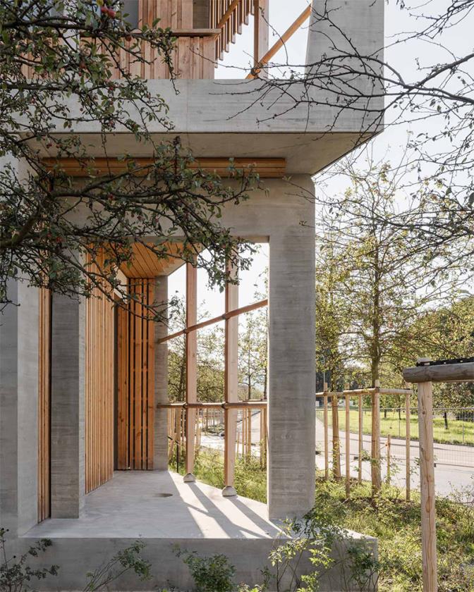 Dal punto di vista compositivo, il complesso si sviluppa come una sequenza di volumi articolati e leggermente scomposti, con facciate che alternano calcestruzzo, legno e superfici vetrate. Il linguaggio architettonico evita ogni monumentalità in favore di una scala frammentata e leggibile, che richiama la dimensione domestica e urbana allo stesso tempo. Le coperture inclinate e le volumetrie sfalsate contribuiscono a ridurre l’impatto visivo dell’edificio, integrandolo nel paesaggio circostante.