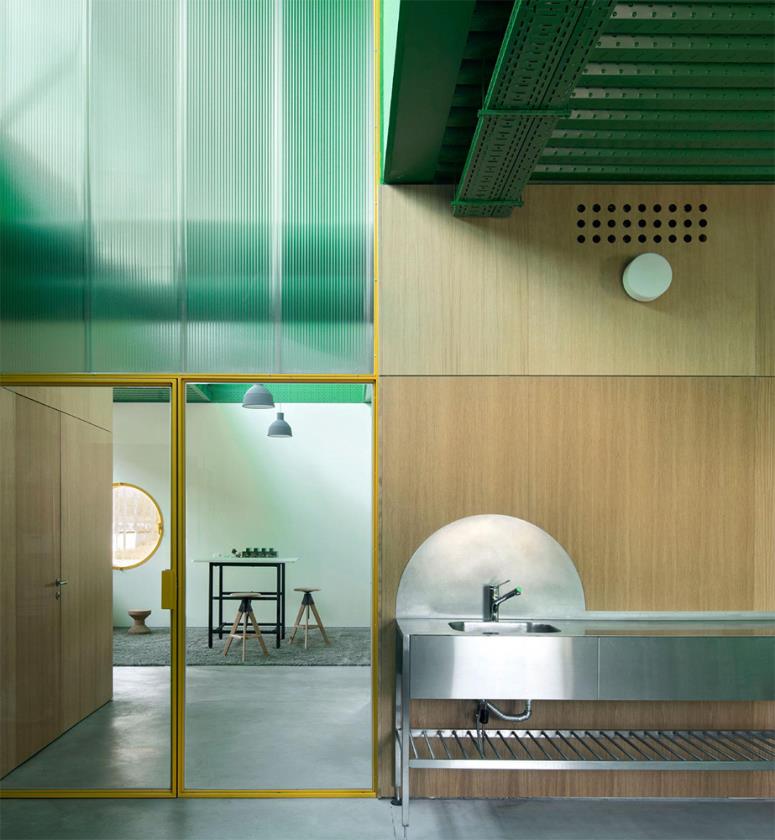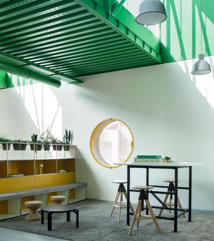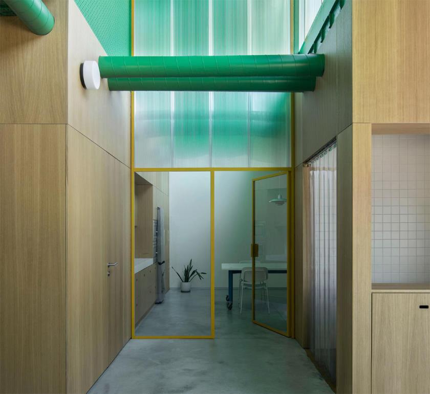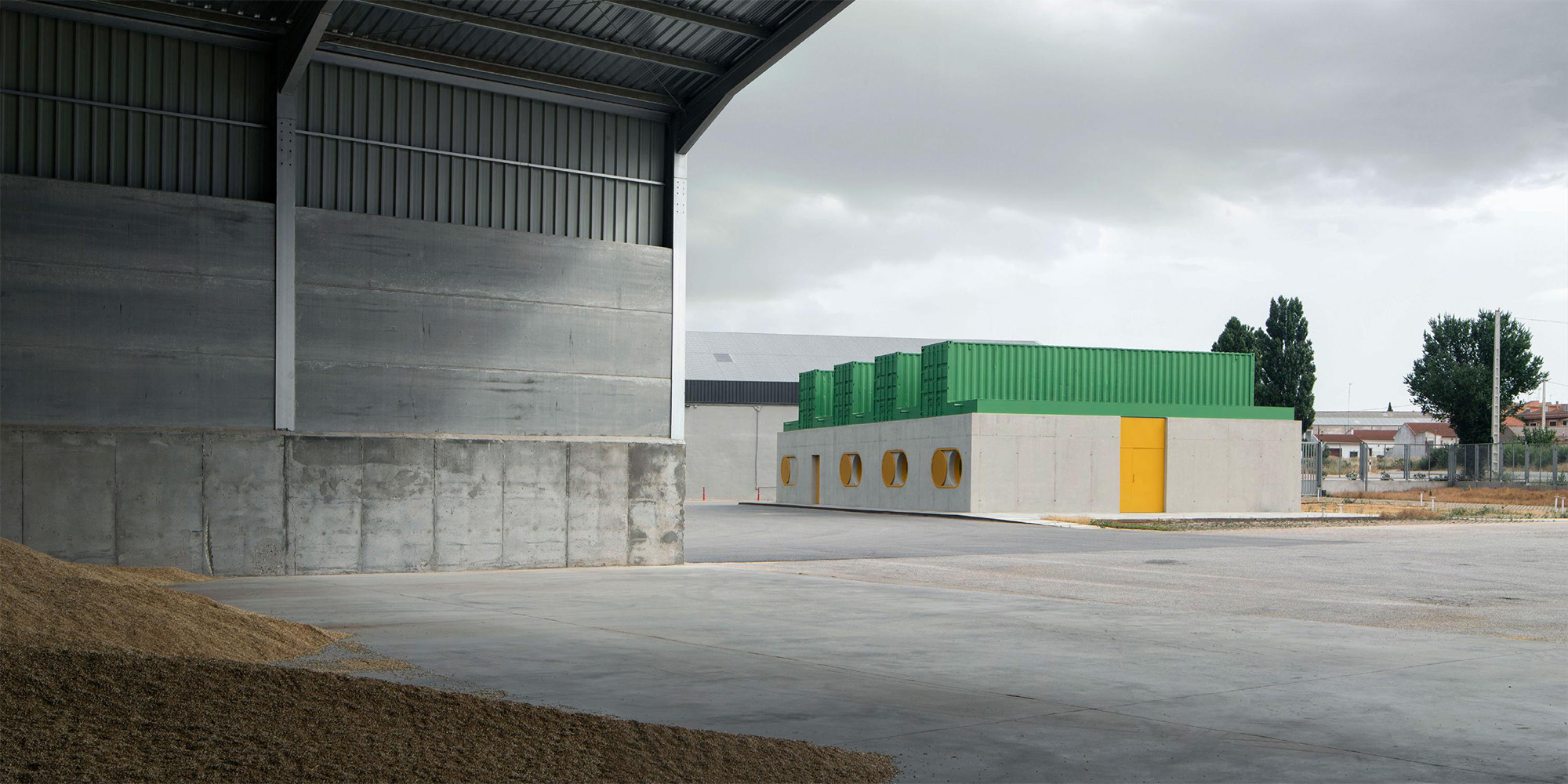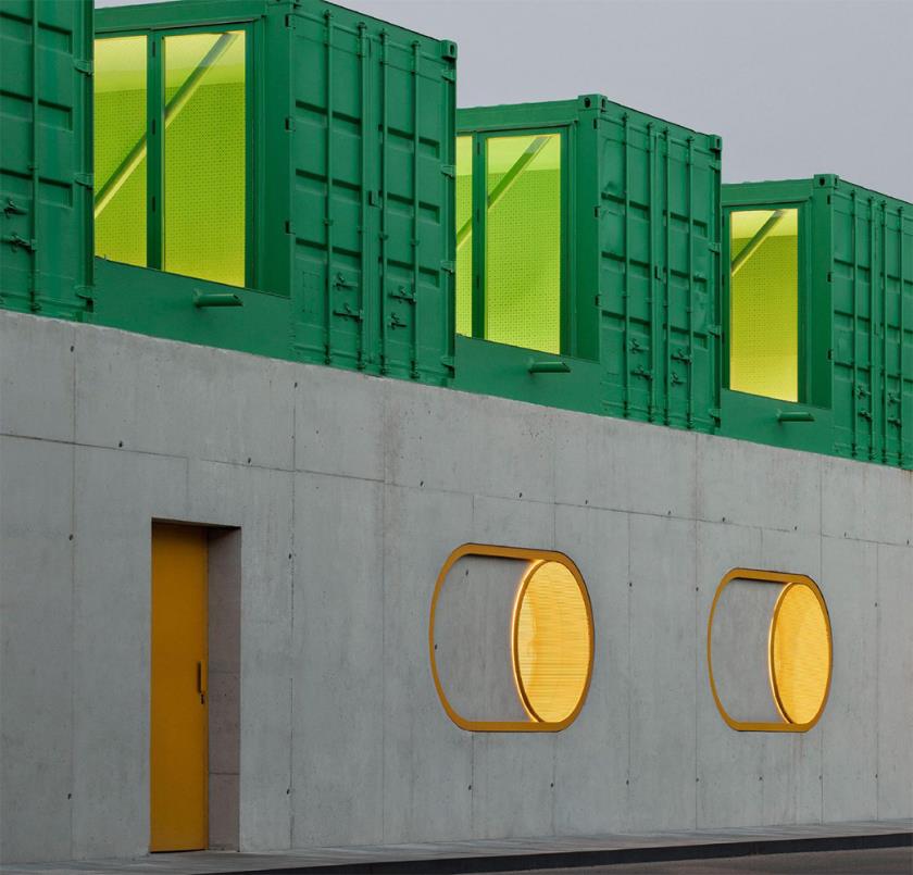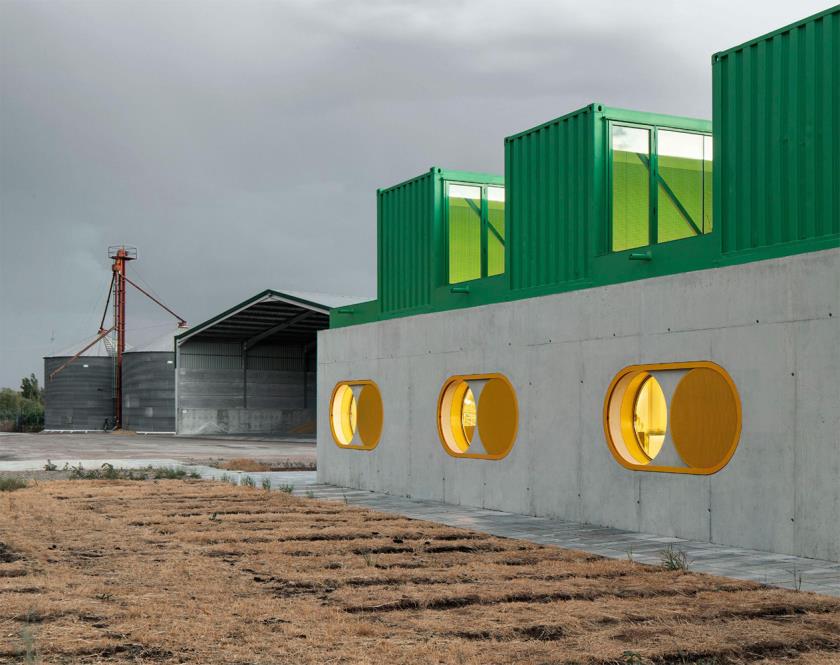 All’esterno, la presenza cromatica è decisa e simbolica: i container sono dipinti in verde, colore corporate di Agrosemillas, mentre il basamento in calcestruzzo chiaro crea un contrasto visivo netto ma coerente con l’ambiente di capannoni. Le facciate presentano ampie aperture circolari, protette da persiane manuali gialle di grandi dimensioni che fungono da dispositivi tattili per regolare luce, ventilazione e privacy, in modo intuitivo e diretto.