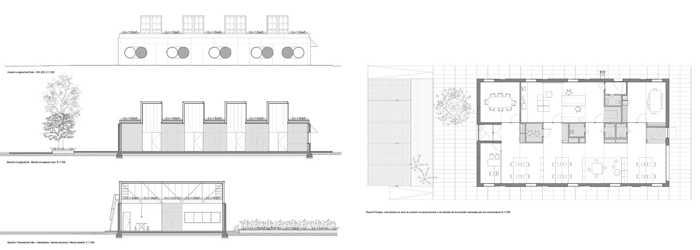 Il progetto si sviluppa su circa 280 m², inserendosi con rispetto nel tessuto industriale di El Peral (Cuenca), dove i riferimenti antropici sono grandi infrastrutture e veicoli pesanti. Qui Impepinable Studio — fondato da Gabriela Barrera e César Plata con un approccio giocoso e pragmatico — ha scelto di impiegare elementi prefabbricati contenitori marittimi riciclati, aperti su due lati e posati su un basamento in calcestruzzo tipico delle strutture industriali locali.