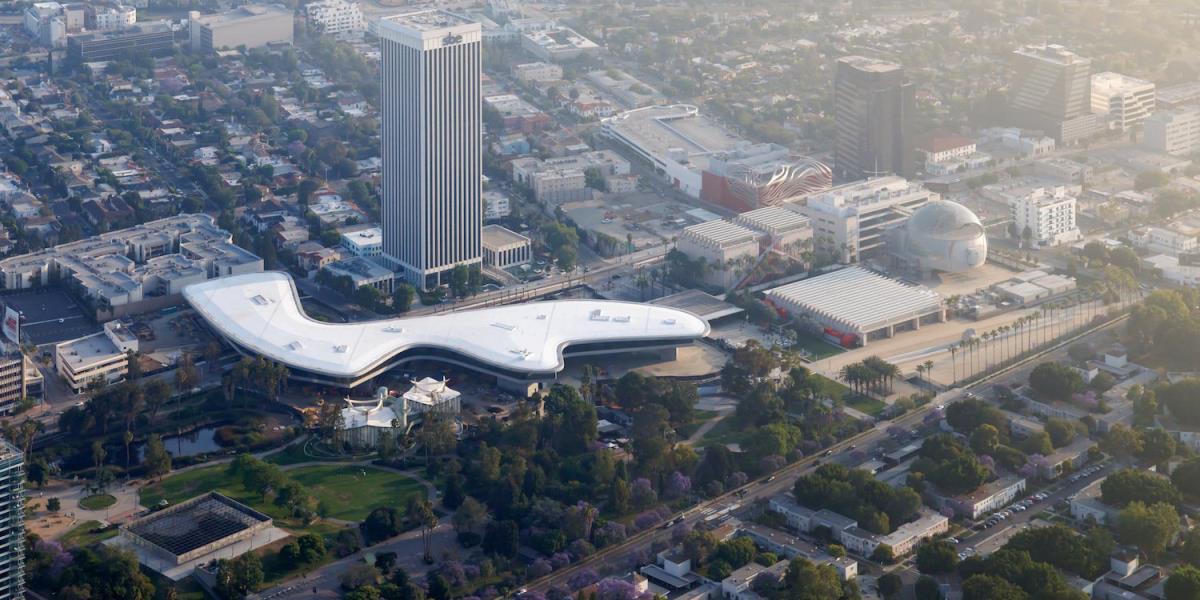 L’edificio si sviluppa come una struttura fluida e organica lunga circa 270 metri, sospesa sopra il suolo e capace di scavalcare l’asse infrastrutturale di Wilshire Boulevard, trasformando un limite urbano in elemento generatore di spazio.