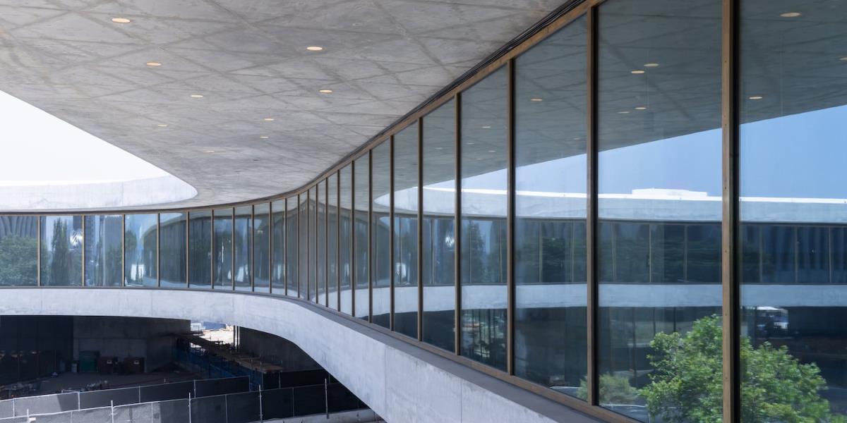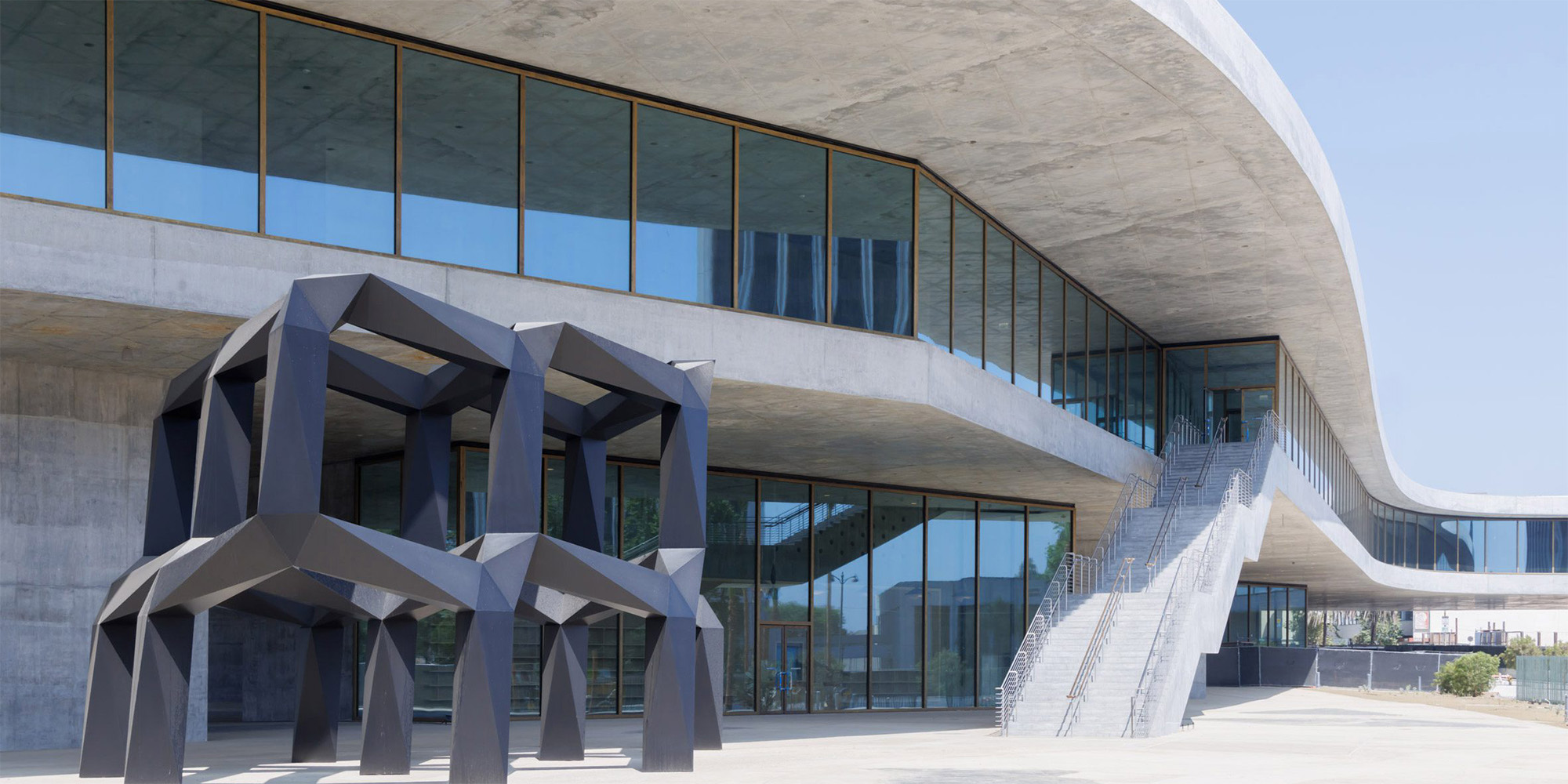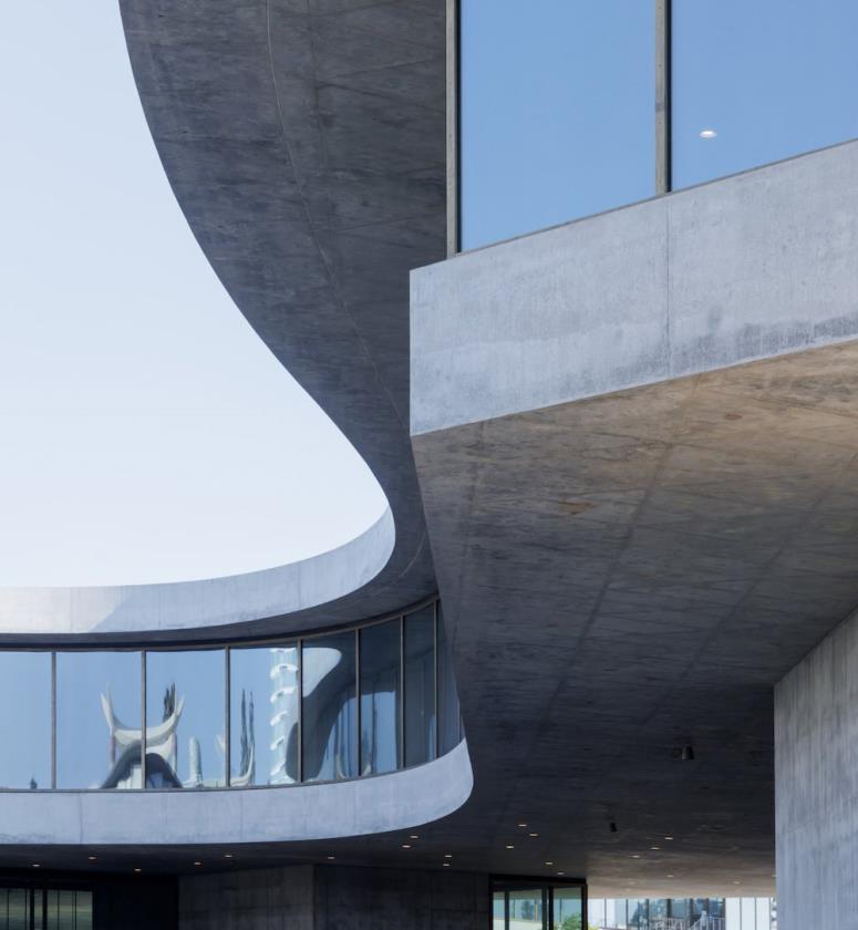 Questa scelta non è solo formale, ma profondamente urbana: il museo diventa infrastruttura, attraversamento e dispositivo di connessione tra parti di città prima separate. Il volume, definito da una geometria curva e continua, è sostenuto da una serie di nuclei strutturali in calcestruzzo che sollevano il livello espositivo principale, liberando il piano terra per funzioni pubbliche, servizi e spazi aperti.
