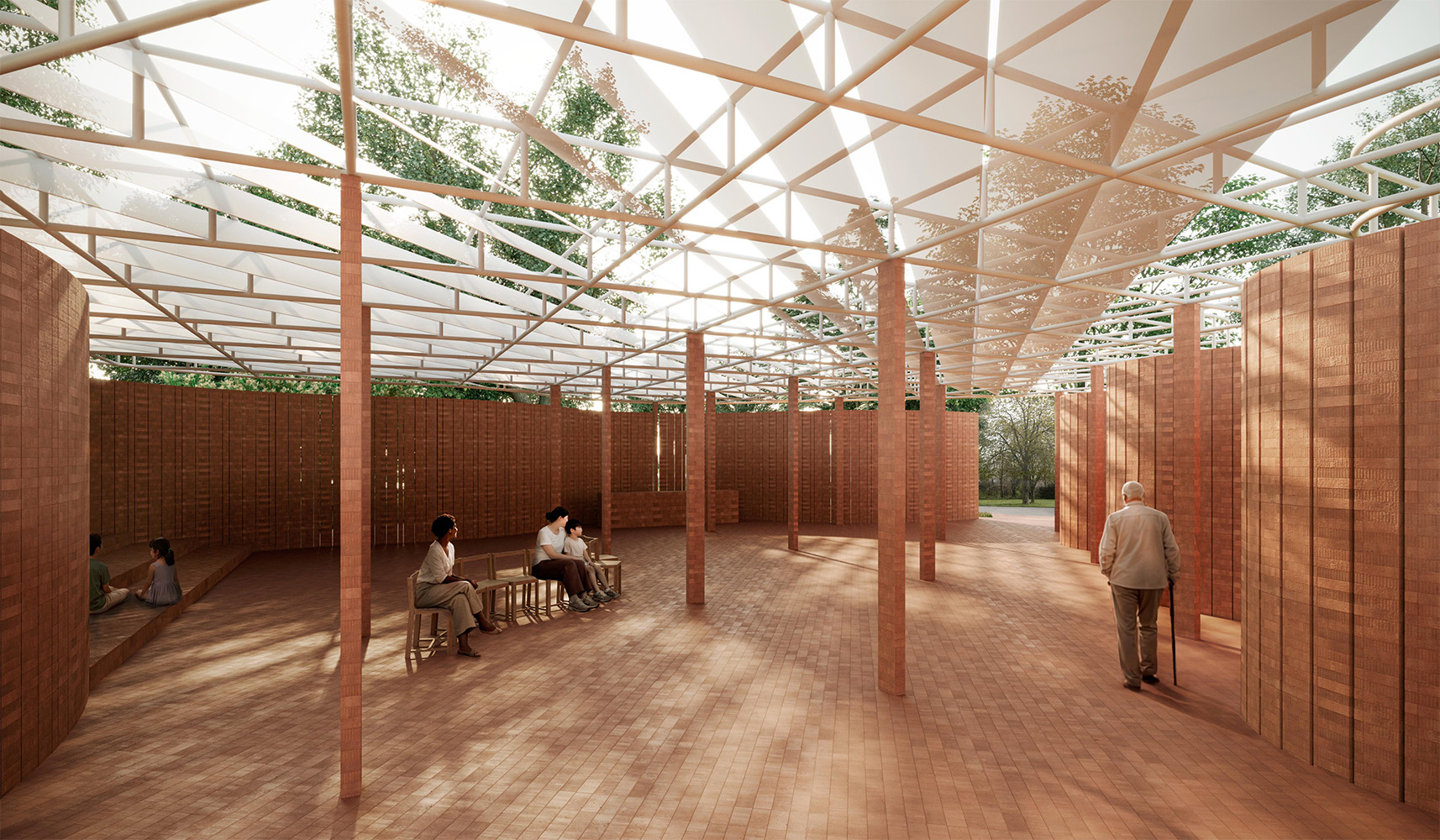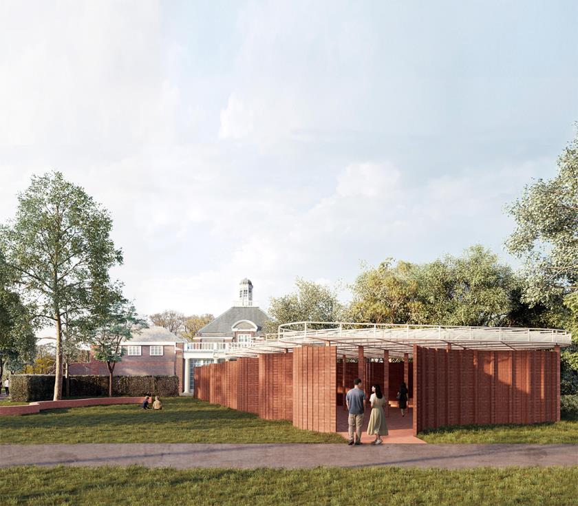 La proposta di Lanza atelier è un'opera di equilibrio: una serie di pareti e colonne in mattoni di semplice argilla si snodano seguendo curve morbide, evocando il serpente e i profili sinuosi del vicino Serpentine Lake. Questo materiale – scelto per la sua connessione con la tradizione dei giardini inglesi e per creare un richiamo alla facciata in mattoni della Serpentine South Gallery, originariamente costruita come padiglione per il tè – diventa simbolo di un'architettura vernacolare capace di accogliere e conversare con il contesto.