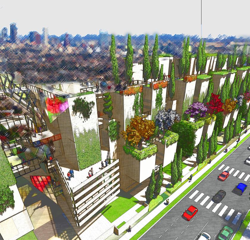 La relazione con la natura non si esaurisce nell'apertura: è parte integrante del progetto. Giardini pensili, terrazze verdi e balconi piantumati si innalzano lungo la facciata, progettati per essere visibili dalla strada e dal parco, e nel tempo destinati ad accogliere vite rampicanti che trasformeranno i volumi in topiarie vegetali verticali.