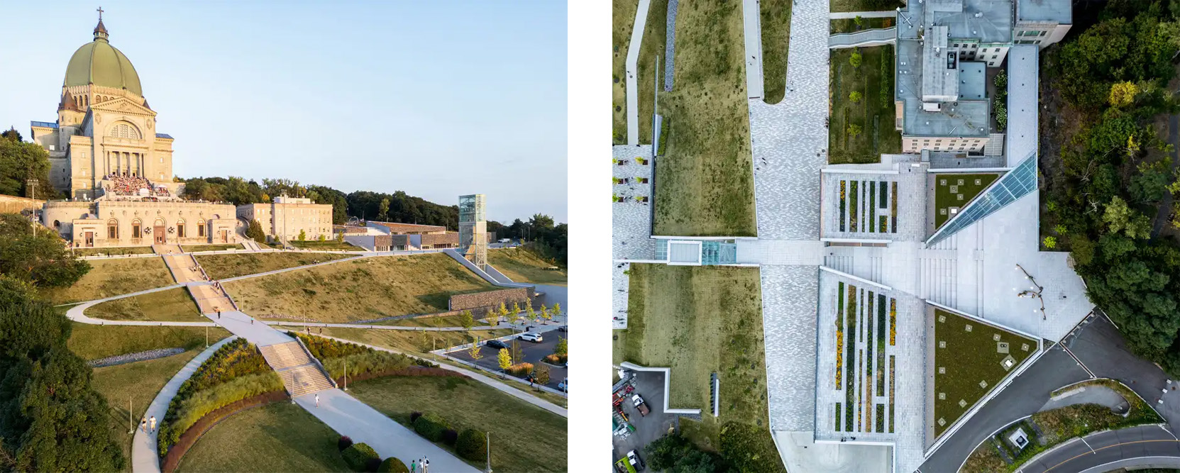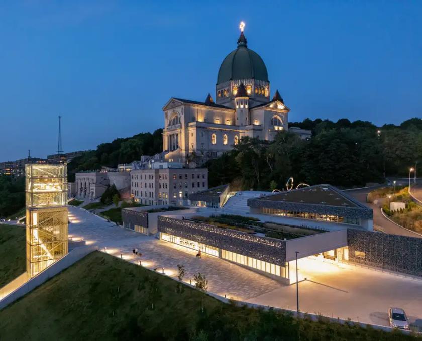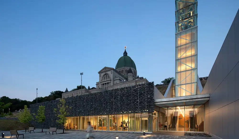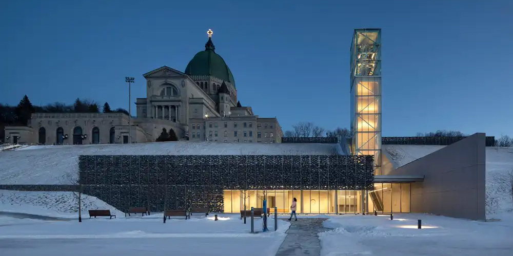 Inserito nel più ampio Grand Development Project del complesso, il padiglione si colloca sul pendio del Mount Royal come un dispositivo di mediazione tra città, paesaggio e architettura sacra. La topografia diventa parte integrante del progetto: il volume emerge dal terreno come un paesaggio costruito, accompagnando il visitatore in un percorso graduale di ascesa verso la basilica. L’architettura assume così il ruolo di soglia, un passaggio che prepara alla dimensione spirituale del luogo senza rinunciare a un linguaggio contemporaneo.