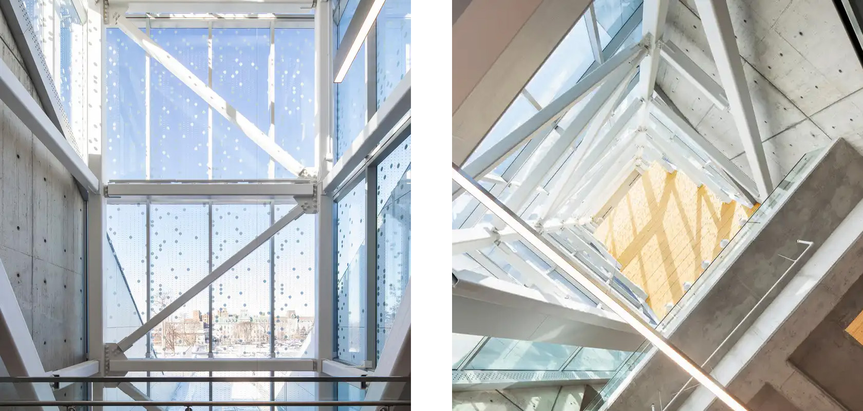 Elemento centrale dell’intervento è il campanile vetrato che ospita l’unico carillon tradizionale del Québec, composto da 62 campane. Molte di esse erano originariamente destinate alla Torre Eiffel e sono state restaurate e integrate con sei nuovi elementi. Il carillon non è soltanto un segno verticale riconoscibile nel paesaggio, ma uno strumento sonoro che scandisce il tempo del luogo e si diffonde sul Mount Royal, trasformando il padiglione in un dispositivo acustico urbano.