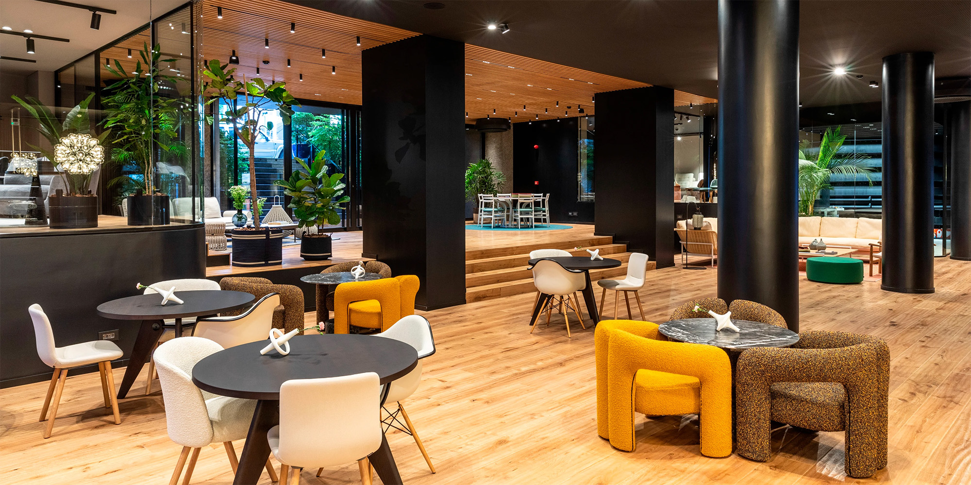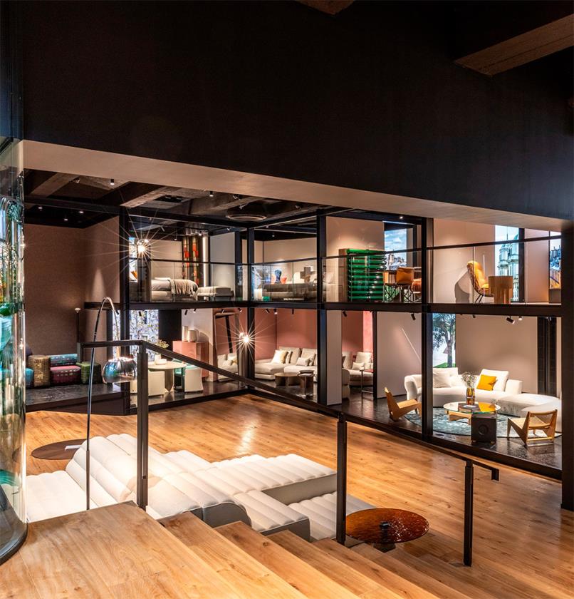 Il luogo è il Sofil Centre, edificio iconico nel quartiere di Achrafieh. Qui Intermeuble aveva già due monobrand: Poltrona Frau (180 m²) e Cassina (240 m²). Con l’acquisizione degli spazi del Metropolis Art Cinema, chiuso nel 2020, si è aperta la possibilità di unire in un unico organismo questi frammenti. Nasce così uno showroom di circa 1800 m², interrato, che oltre a integrare i marchi esistenti introduce un terzo monobrand, Vitra. Una sfida di flussi e dislivelli risolta con leggerezza scenografica, grazie a un sistema spaziale che evoca il set teatrale: un condensatore di narrazioni, più che un semplice punto vendita.
