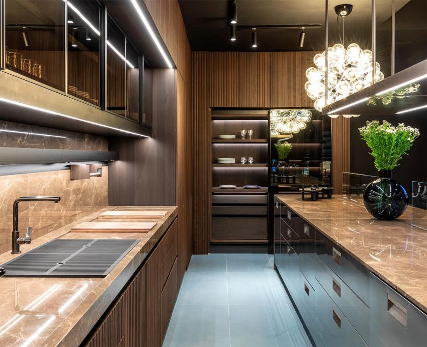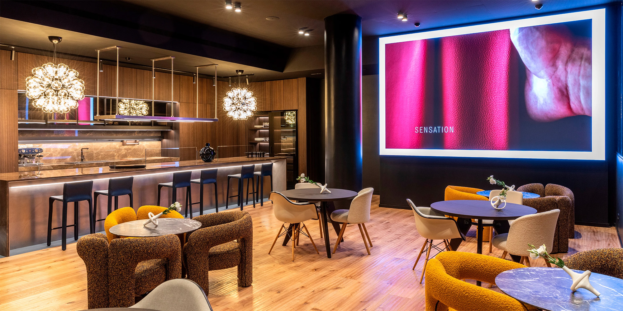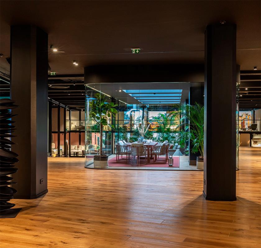 La luce artificiale, calibrata come luce naturale, trasforma l’interrato in un ambiente senza tempo. I materiali, scelti con cura, amplificano la percezione tattile: superfici lisce e opache si alternano a trasparenze, con dettagli capaci di risuonare con i brand ospitati.
