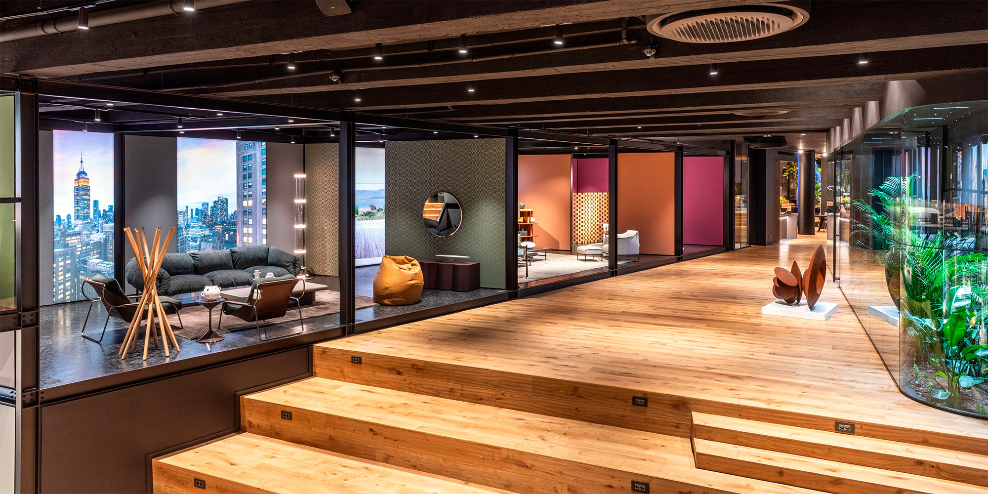 Qui si innestano funzioni di relazione: una caffetteria firmata Arclinea, una Materioteca ricca di campioni, un grande Led Wall come sfondo visivo. Da questo nodo il visitatore accede al cuore del sistema: una platea multiforme su cui si aprono ventisei ambientazioni modulari, distribuite lungo tre lati come quinte scenografiche. Ogni box ospita un brand, e la progressione sfrutta la pendenza originaria della sala cinematografica, articolandosi tra singole e doppie altezze.