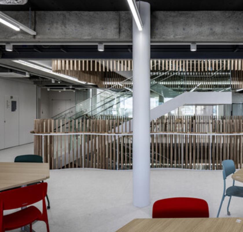 Affrontare le condizioni normative e ambientali del sito ha richiesto soluzioni ingegnose: nel rispetto dei limiti di altezza imposti dall'area protetta, l'altezza dei solai è stata ottimizzata con l'uso di sistemi strutturali innovativi come travi piatte e solaio a piastra, consentendo al contempo soffitti interni spaziosi. Le installazioni meccaniche sono lasciate a vista, trasformando ciò che spesso è nascosto in un elemento compositivo che racconta la logica costruttiva.