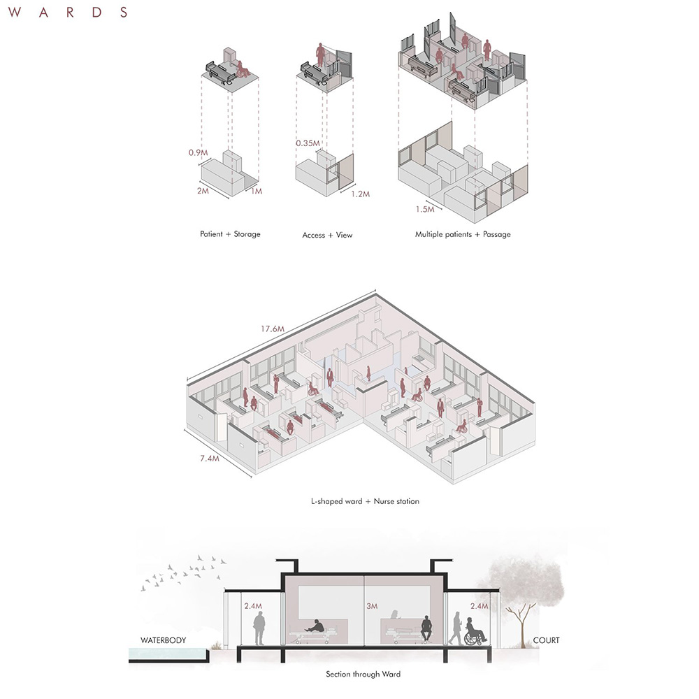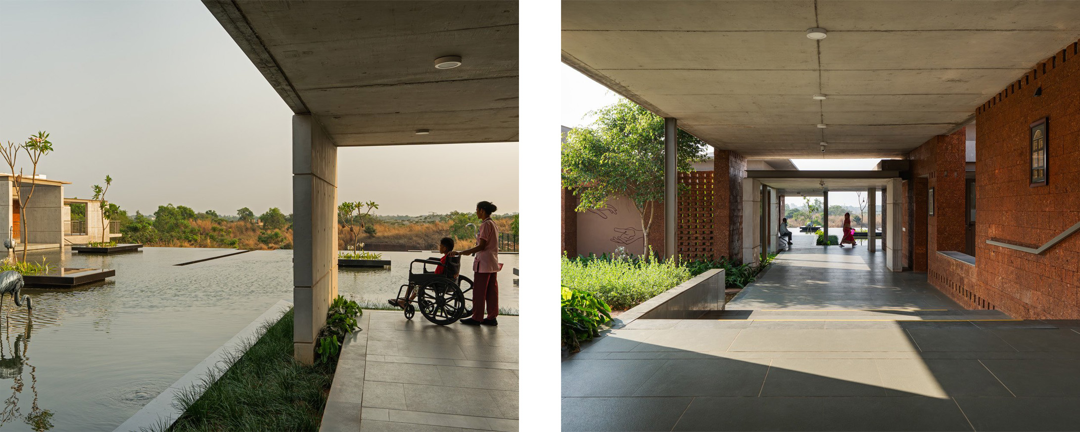 Al centro dell'esperienza fisica e simbolica, sei padiglioni a forma di "L" accolgono i 110 letti per i pazienti, disposti attorno a uno specchio d'acqua che funge da fulcro meditativo. Le ampie verande, cornici di luce e ombra, diventano luoghi di incontro, contemplazione e sostegno alle famiglie.