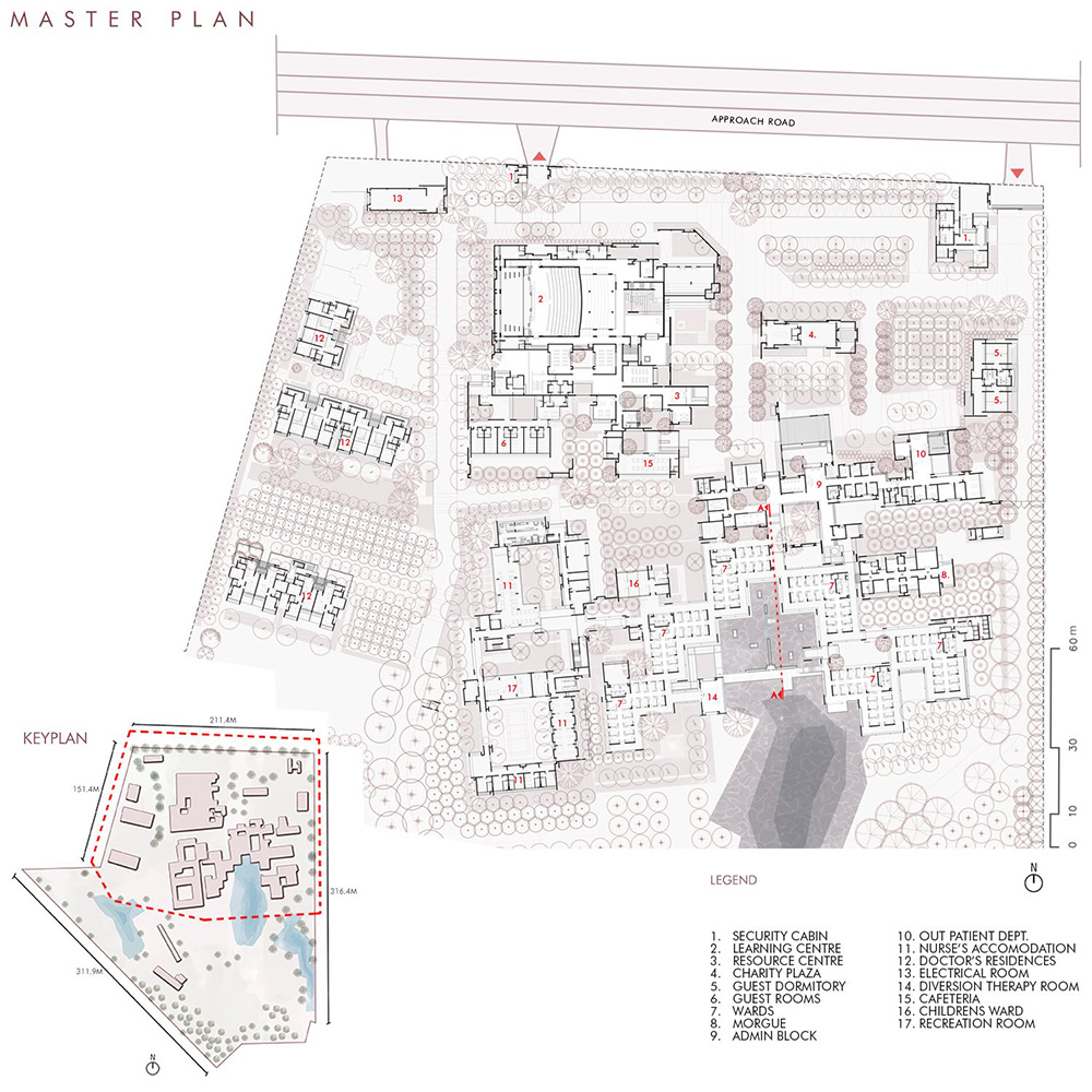 Il complesso ospita reparti per adulti e bambini, alloggi per il personale, un centro di apprendimento, un auditorium da 500 posti e servizi di supporto, distribuiti in edifici bassi che seguono la topografia naturale del sito. Le depressioni naturali, residuo del passato di cava lateritica, sono state trasformate in bacini per la raccolta dell'acqua piovana e in elementi di paesaggio, restituendo un senso di pace e riflessione.