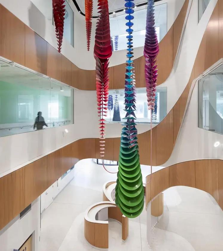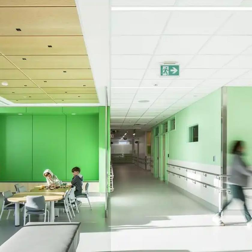 Uno degli aspetti più evidenti della strategia architettonica è la “sequenza di percorsi intuitivi” pensata per guidare utenti, famiglie e personale attraverso gli spazi. L’accesso principale è segnato da un’ampia hall di accoglienza caratterizzata da un’altezza libera maggiore rispetto ai piani di degenza: qui le superfici in legno e finiture calde si combinano con la luce naturale per mitigare l’esperienza spesso ansiogena di una struttura sanitaria. Il linguaggio materico utilizzato nelle aree comuni — tavole di legno, pavimenti chiari e finiture opache — contribuisce a creare una percezione di umanità e benessere, restituendo al visitatore uno spazio che è al tempo stesso clinico e accogliente.