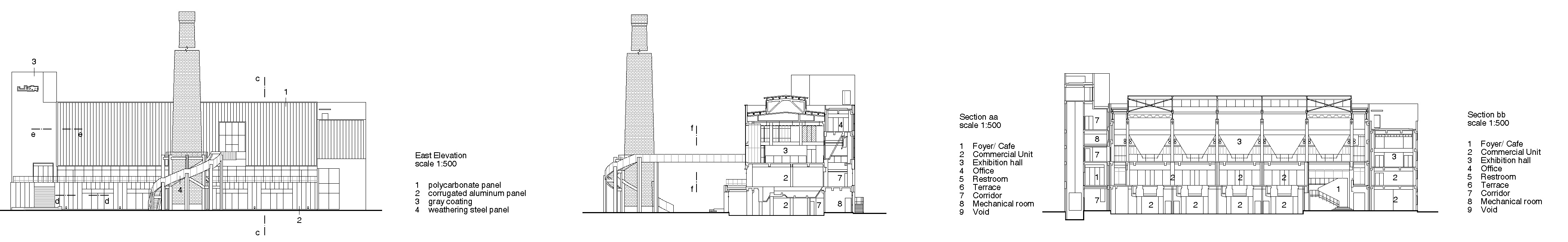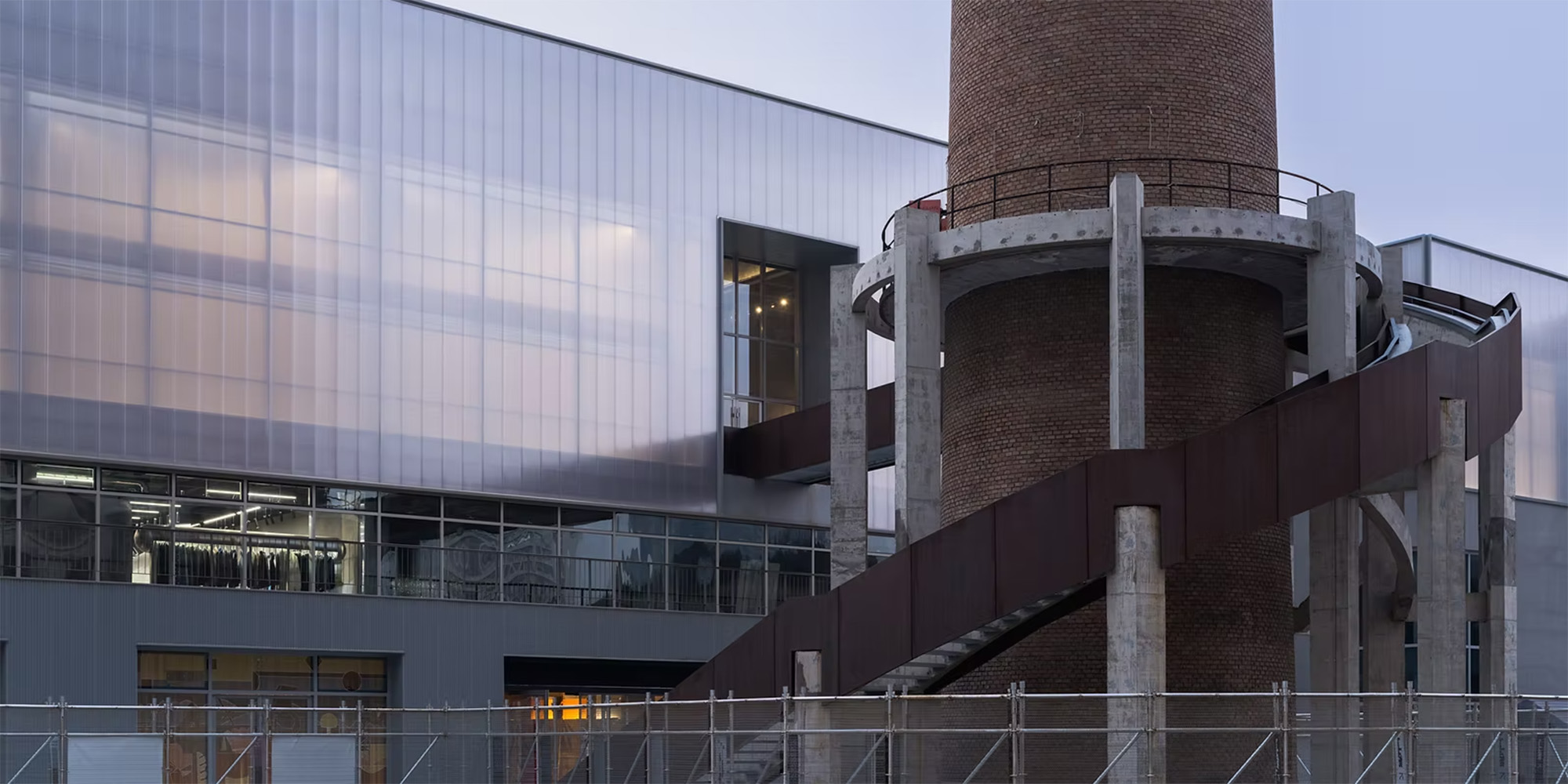 All'interno, lo spazio della sala caldaie è stato liberato dalle tamponature murarie originali e trasformato in un grande ambiente espositivo. Il telaio in cemento armato è ora visibile attraverso una facciata traslucida in policarbonato, che cattura la luce naturale e ammorbidisce il rapporto tra interno ed esterno. I silos del carbone, conservati come resti archeologici industriali, punteggiano l'area espositiva come oggetti scultorei, evocando il passato senza sacrificarne l'ergonomia contemporanea.