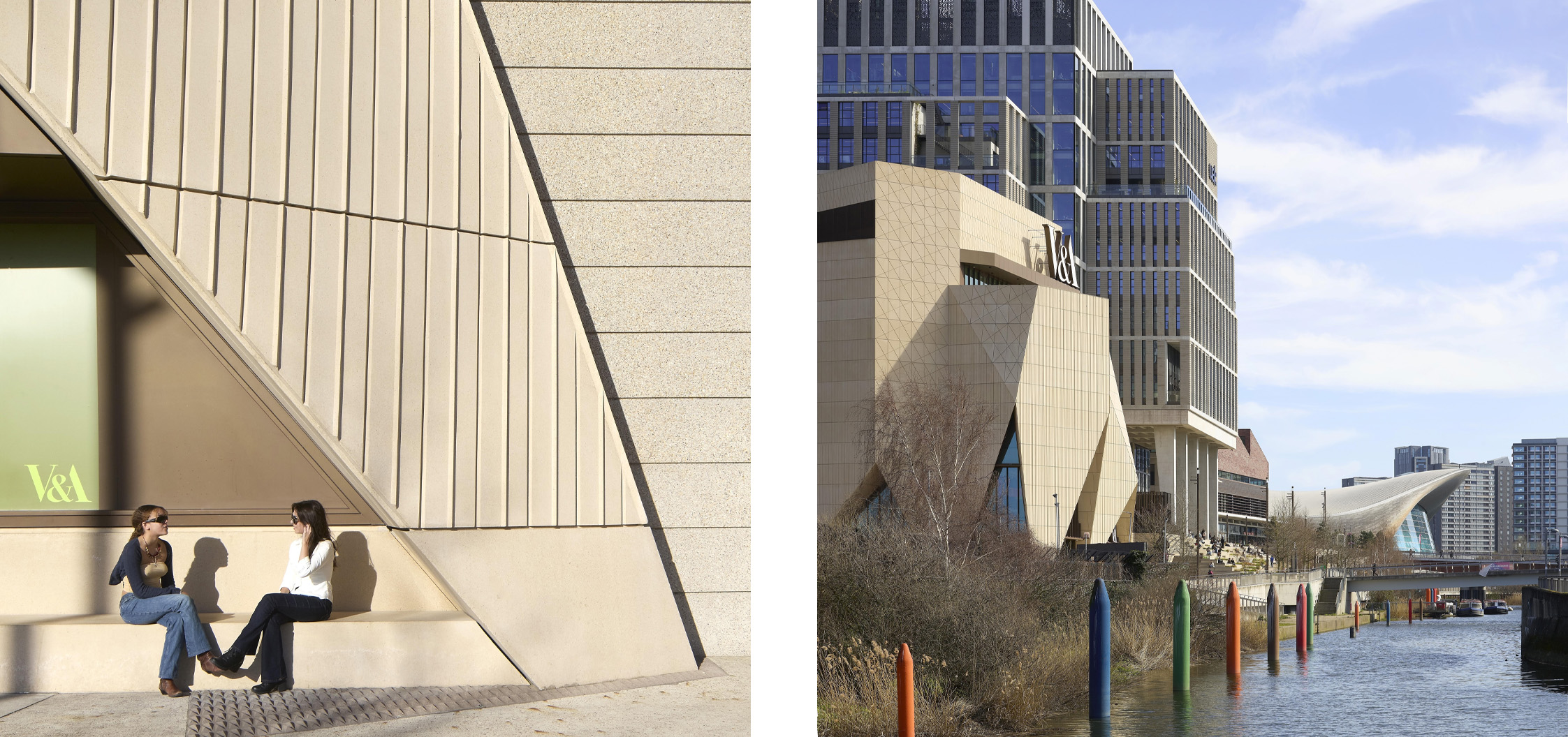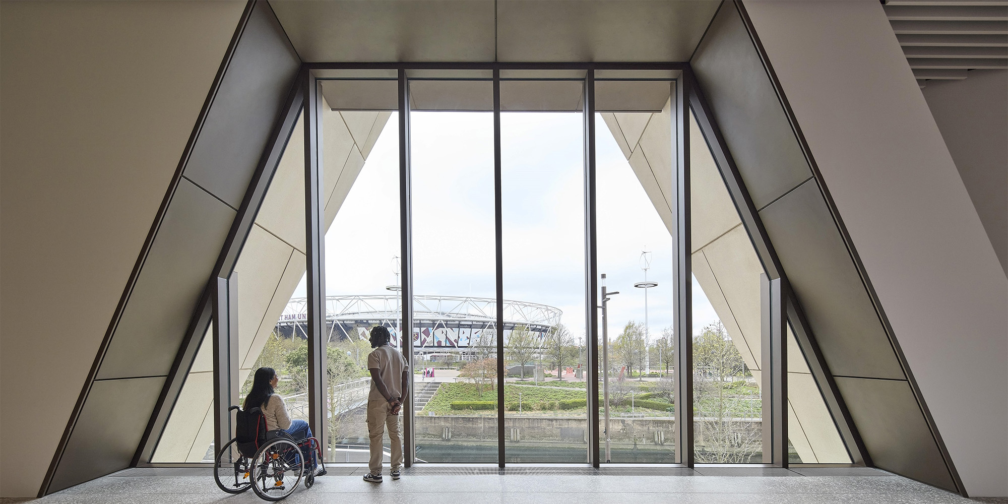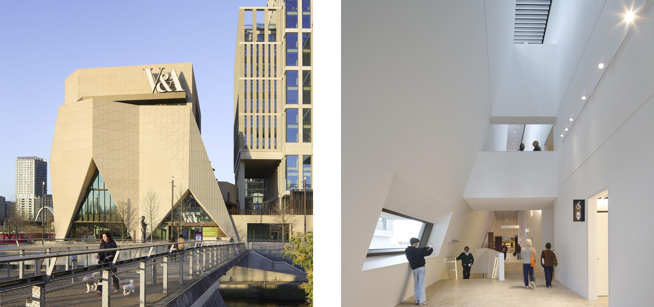 Anche il rapporto tra interno ed esterno è costruito in modo continuo. Le grandi superfici vetrate e le aperture nelle terrazze permettono una forte permeabilità visiva, mentre la presenza di spazi pubblici esterni rafforza l’idea di museo come estensione della città. L’edificio non si chiude su se stesso, ma si comporta come un’interfaccia urbana attiva, capace di dialogare con il parco olimpico e con i flussi pedonali dell’East London.