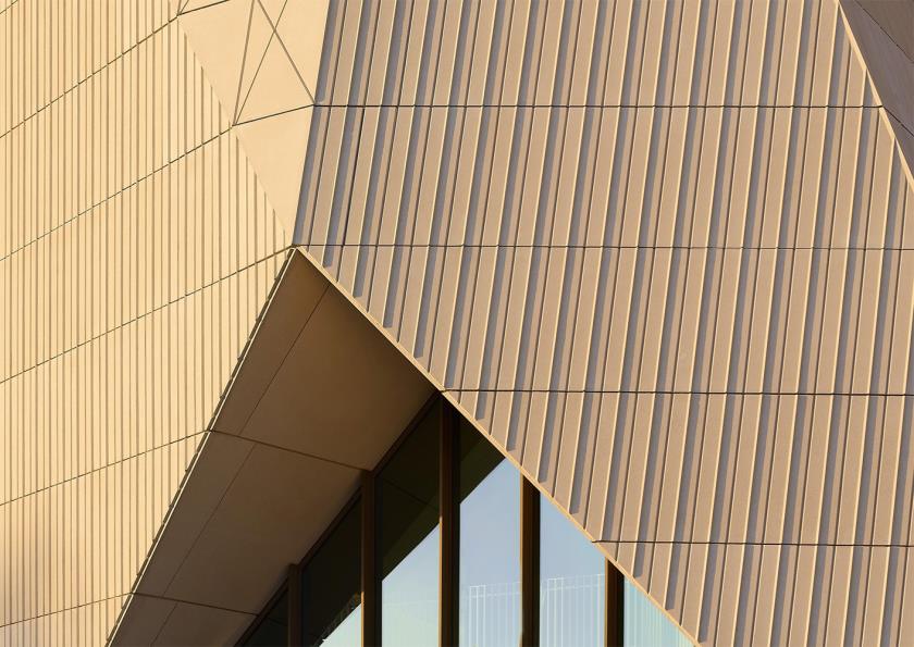 Dal punto di vista costruttivo, la scelta del calcestruzzo prefabbricato non risponde solo a esigenze strutturali, ma anche a una precisa strategia estetica e ambientale. La ripetizione controllata degli elementi consente una maggiore efficienza in fase di costruzione, mentre la variazione geometrica dei pannelli introduce complessità visiva senza ricorrere a materiali aggiuntivi. Il risultato è un edificio che combina rigore tecnico e espressività formale in un unico sistema coerente.