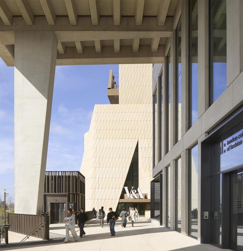 La relazione con il contesto urbano è centrale nella concezione del progetto. Il V&A East Museum si inserisce infatti nel più ampio masterplan dell’East Bank, un distretto culturale sviluppato dopo le Olimpiadi del 2012 che ospita istituzioni come Sadler’s Wells, la London College of Fashion e la BBC. In questo scenario, il museo non è un oggetto isolato ma un tassello di una nuova infrastruttura culturale lineare, che collega istituzioni, spazio pubblico e waterfront.